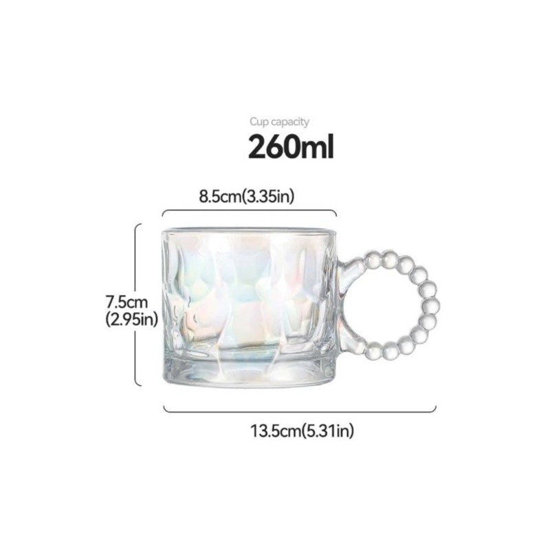 Wymiary: Wysokość - 7,5 cm Średnica - 8,5 cm Szerokość ucha- 5 cm Pojemność - 260 ml Szklanka spakowana w pudełko jednostkowe o wymiarach: 13 cm x 9,5