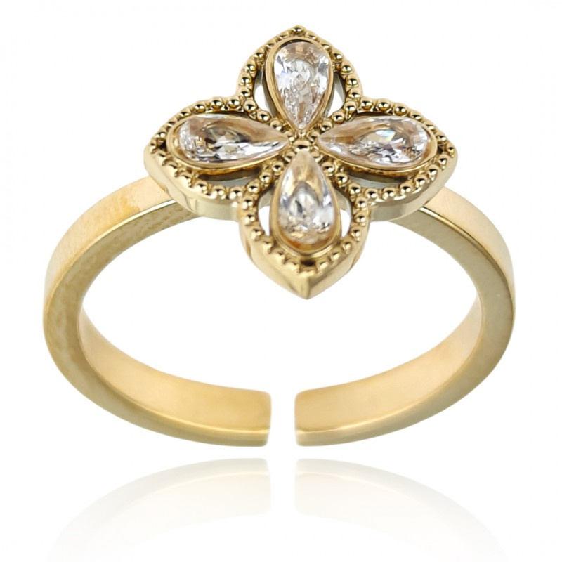 Nowa kolekcja biżuterii ze stali szlachetnej Pierścionek platerowany 14-karatowym złotem Rozmiar: uniwersalny, regulowany Szerokość: 1,9cm Wymiary