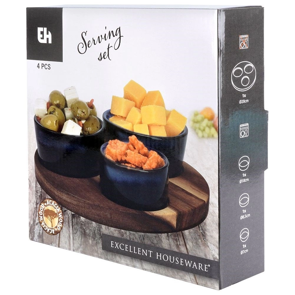- Zestaw trzech miseczek na okrągłej tacy do serwowania przekąsek, przystawek, sosów, dipów i innych. Taca wykonana z drewna akacjowego a miseczki z ceramiki.