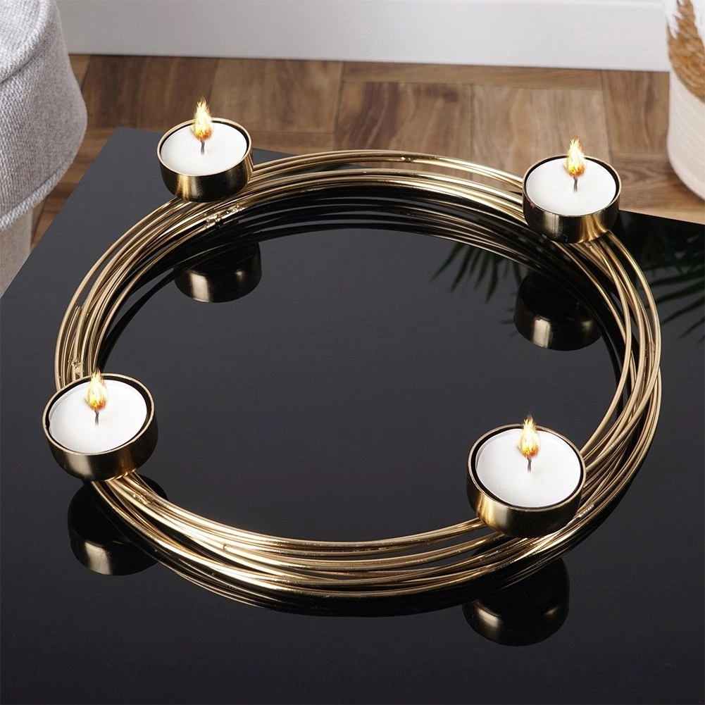 - Świecznik na cztery świeczki tealight. Wykonany z metalu w kolorze złotym. Świetnie sprawdzi się jako świecznik adwentowy. Utrzymany w industrialnym stylu typu loft.