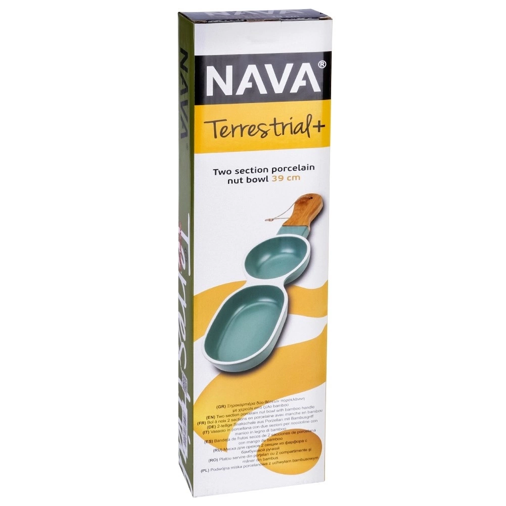 Porcelanowy talerz na przekąski z bambusowym uchwytem. Sprawdzi się do efektownego podawania słonych przekąsek, słodyczy lub dipów. Solidnie wykonany w modnej kolorystyce. Taka forma podania przekąsek jest bardzo efektowna. Dzielona powierzchnia pozwoli na odpowiednie oddzielenie przekąsek by nie mieszały się smaki. Talerz ma uniwersalny wygląd, pasuje do wielu okazji. Sprawdzi się do użytku domowego oraz profesjonalnego np. w lokalach gastronomicznych. W celu odpowiedniej konserwacji nie zaleca się mycia w zmywarce do naczyń. Oryginalny produkt greckiej marki NAVA z linii naczyń stołowych Terrestrial. Wyprodukowano zgodnie z europejskimi standardami.
