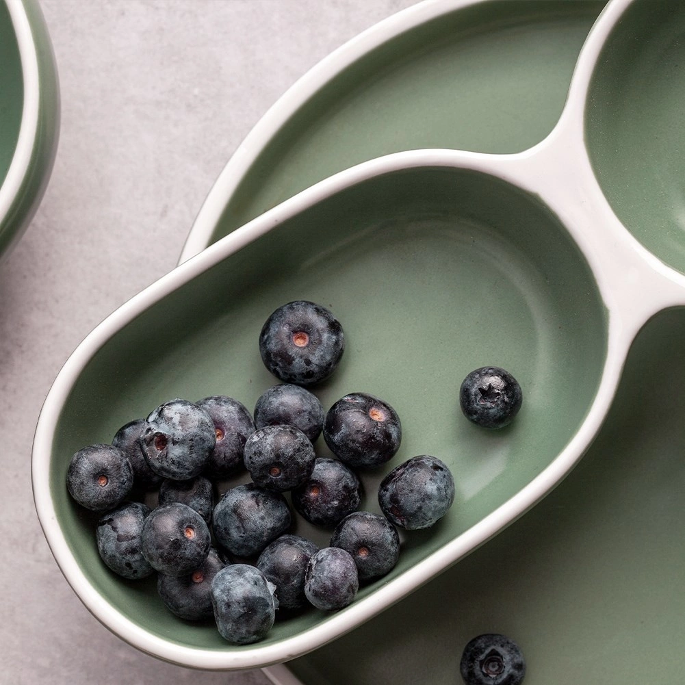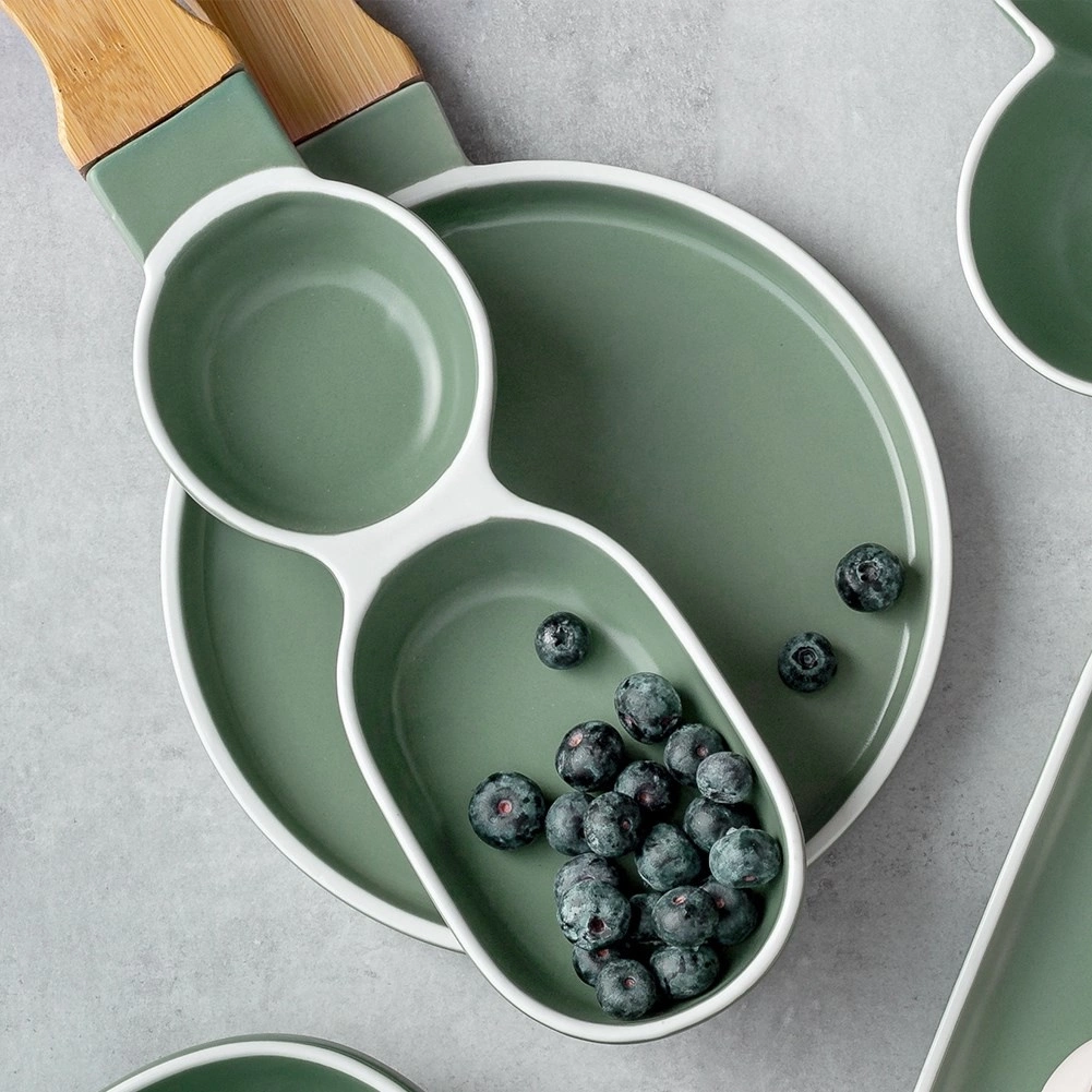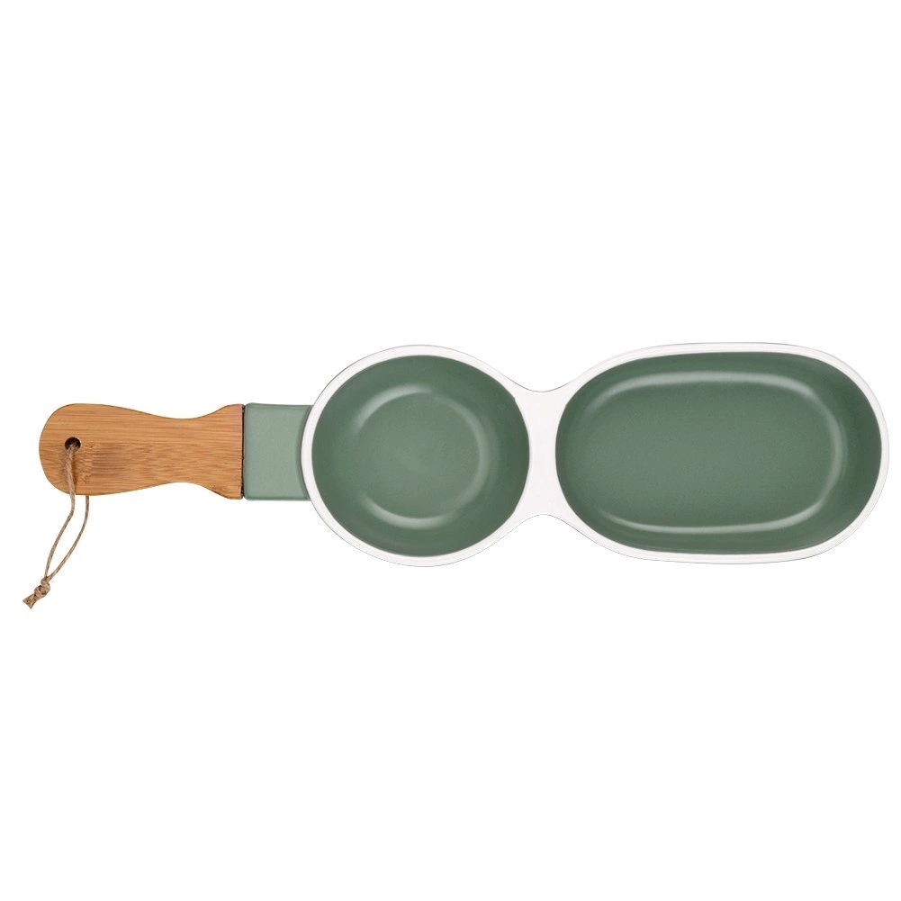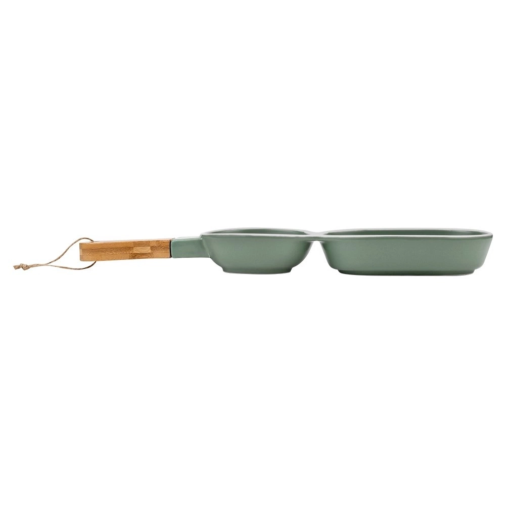 - Talerz z uchwytem, dzielony na dwie części. Idealny na dipy oraz przekąski. Wykonany z porcelany w zielonym kolorze i drewna bambusowego. Prezentuje się niezwykle elegancko i nowocześnie.