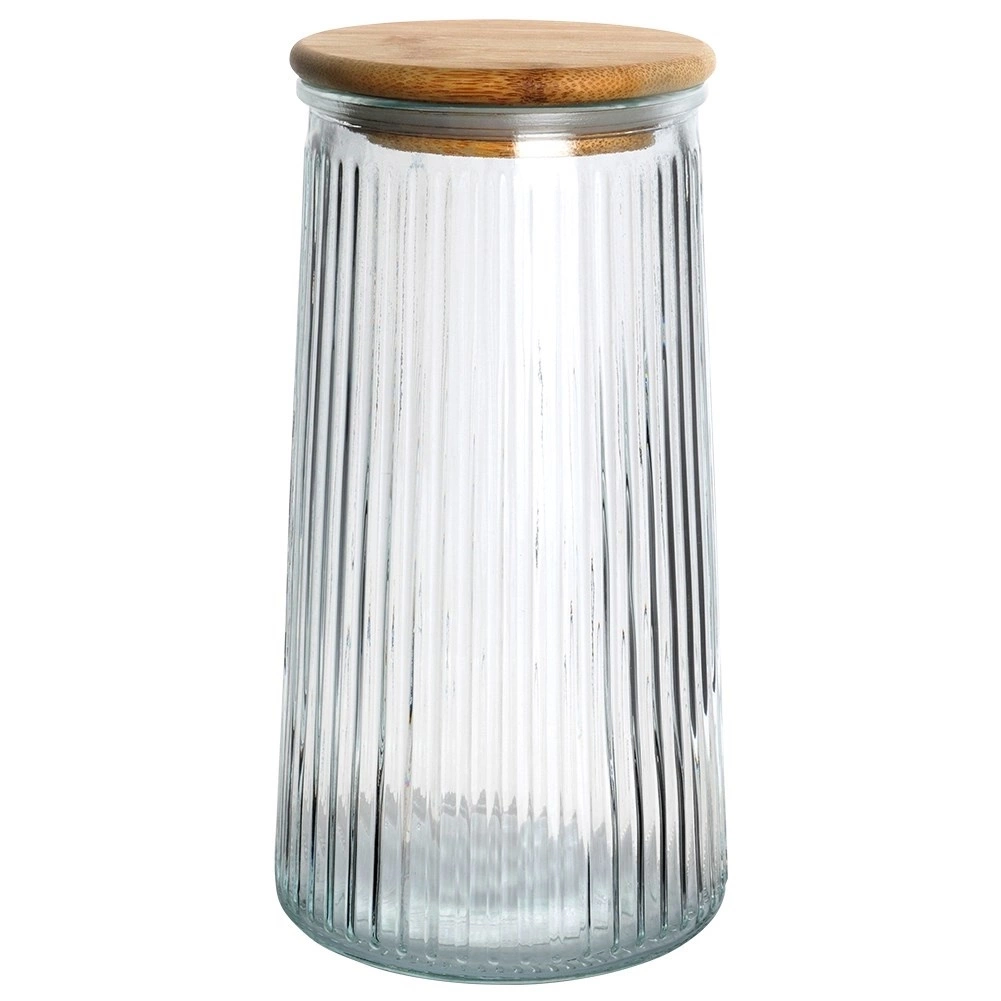 - SOLIDNY - Pojemnik wykonany z grubego szkła, które posiada ryflowaną powierzchnię, dzięki czemu prezentuje się niezwykle efektownie. Pokrywka wykonana z drewna bambusowego. Przezroczyste szkło pozwoli nam w łatwy sposób sprawdzić zawartość pojemnika.