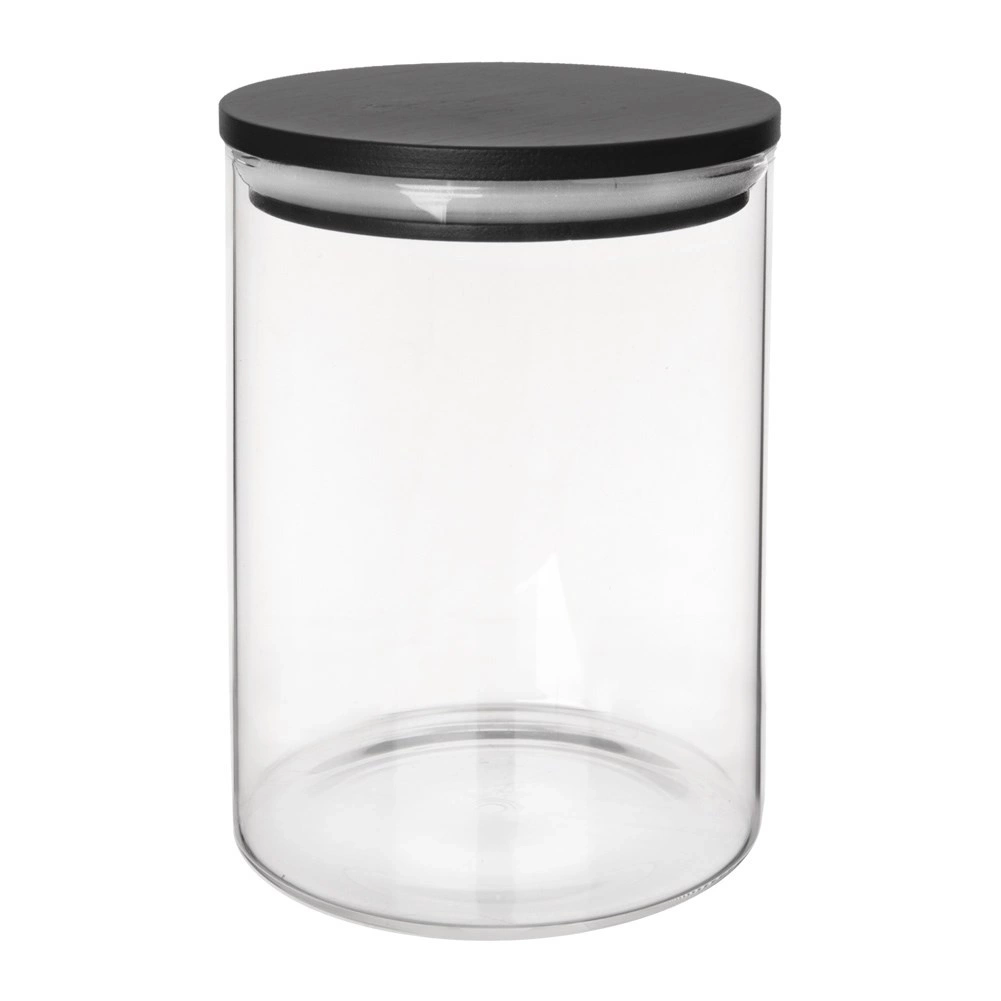 - SOLIDNY - Pojemnik wykonany ze szkła borokrzemowego, które cechuje się dużą odpornością na zmianę temperatur. Pokrywka z drewna bambusowego malowanego na czarno.