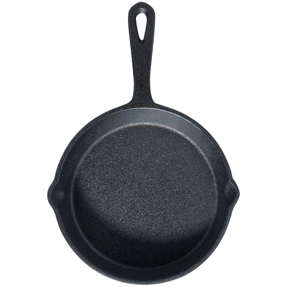 - Patelnia żeliwna o średnicy 15 cm z dwoma wylewkami. Można stosować ją na indukcji, w piekarnikach, na piecu i bezpośrednio na ogniu.
