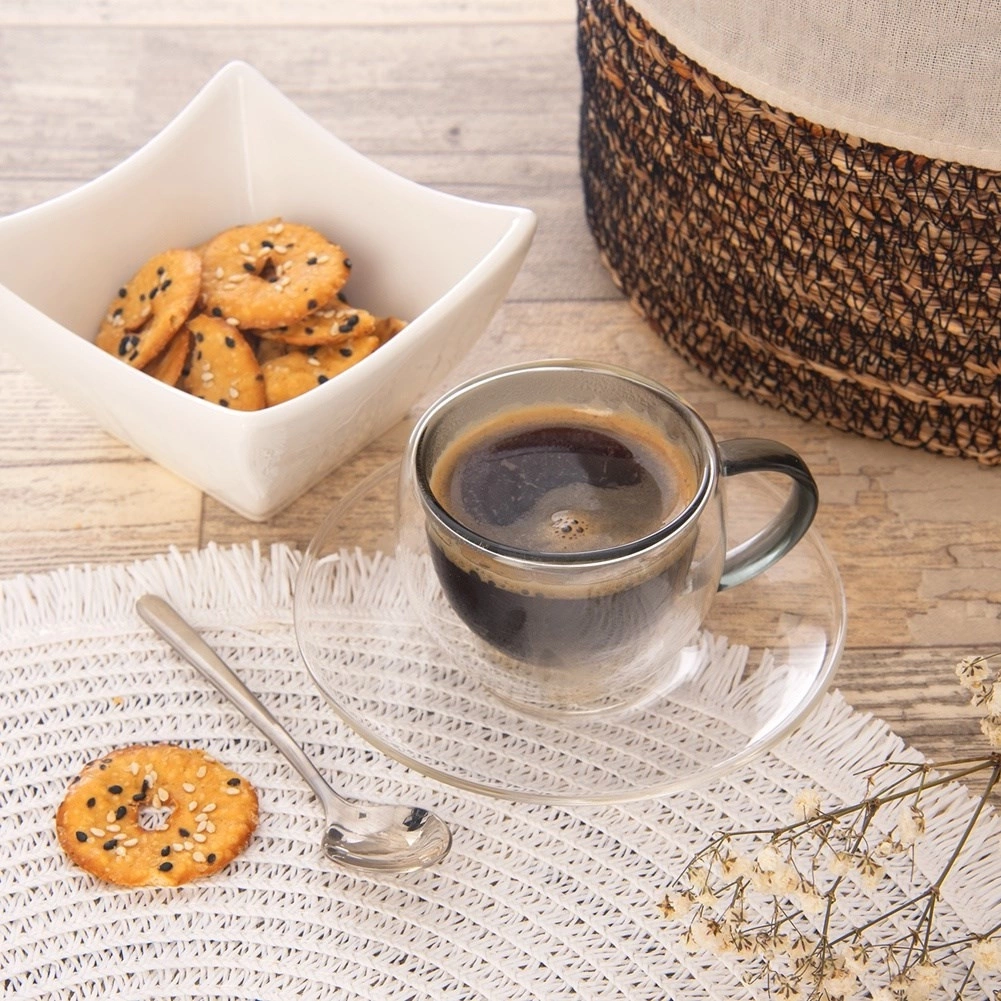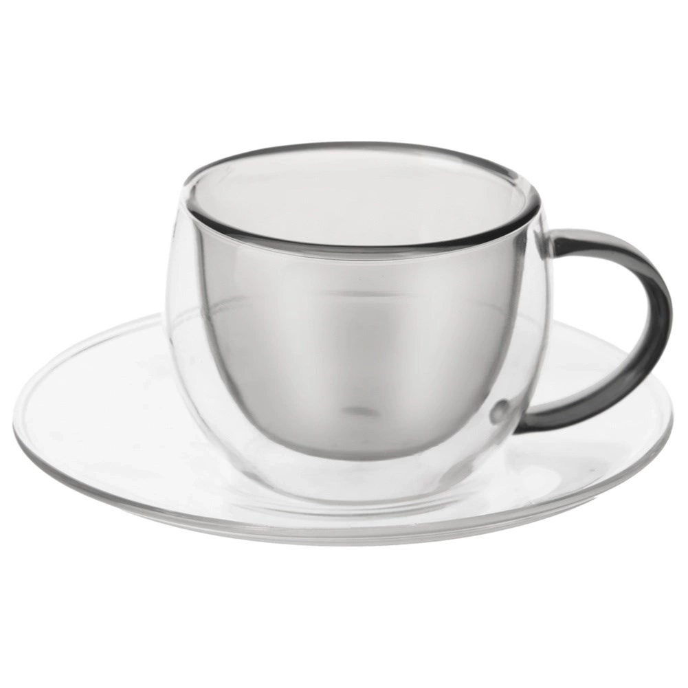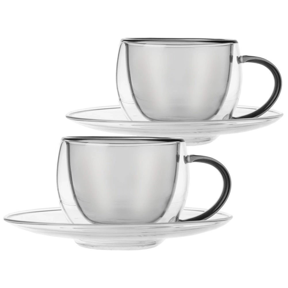 - Zestaw dwóch filiżanek termicznych z podwójną ścianką w zestawie ze spodkami. Filiżanki mają pojemność 90 ml, więc są idealne do espresso i espresso doppio.