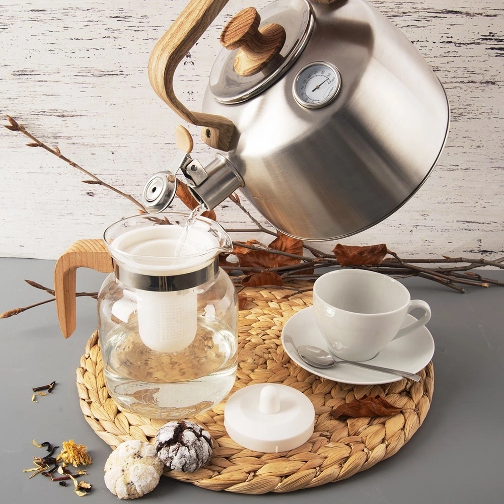 - Stalowy czajnik z gwizdkiem - Czajnik wykonany ze stali nierdzewnej w srebrnym kolorze. Posiada uchylny gwizdek oraz zdejmowaną pokrywkę. Czajnik ma pojemność całkowitą 3,2 l a pojemność użytkową 1,9 l, wysokość czajnika to 21 cm.