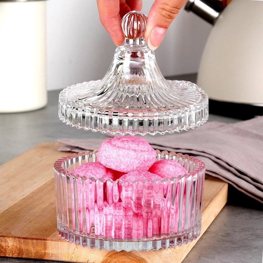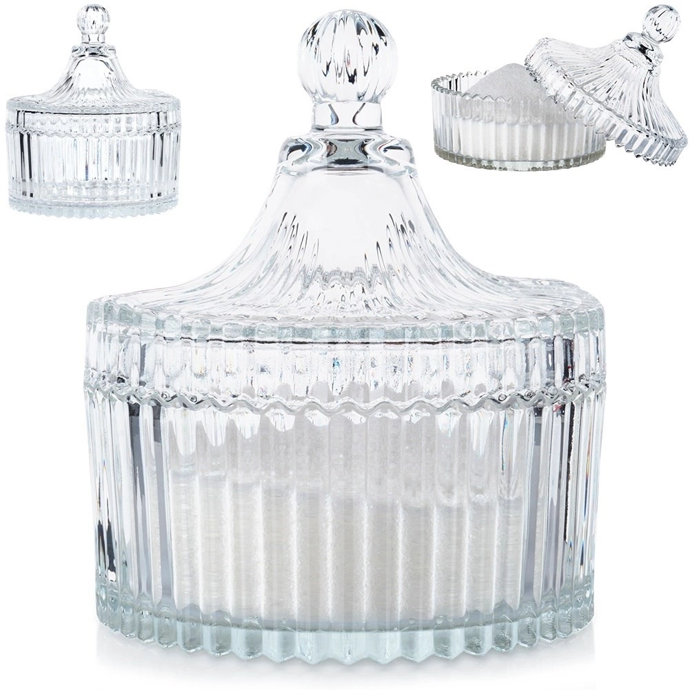 - Elegancka cukiernica wykonana ze szkła, swoim wyglądem przypomina kryształ. Idealna również do zalewania świec oraz jako mały pojemnik dekoracyjny do przechowywania przekąsek lub słodkości.
