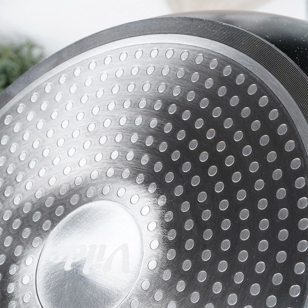 - Nieprzywierająca powłoka granitowa - Patelnia wykonana z aluminium z nieprzywierającą powłoką granitową w czarnym kolorze. Powierzchnia nieprzywierająca umożliwia przygotowywanie zdrowych i smacznych posiłków z minimalną ilością tłuszczu. Patelnia i pokrywka posiadają uchwyt wykonany z najwyższej jakości, wytrzymałego tworzywa imitującego drewno.