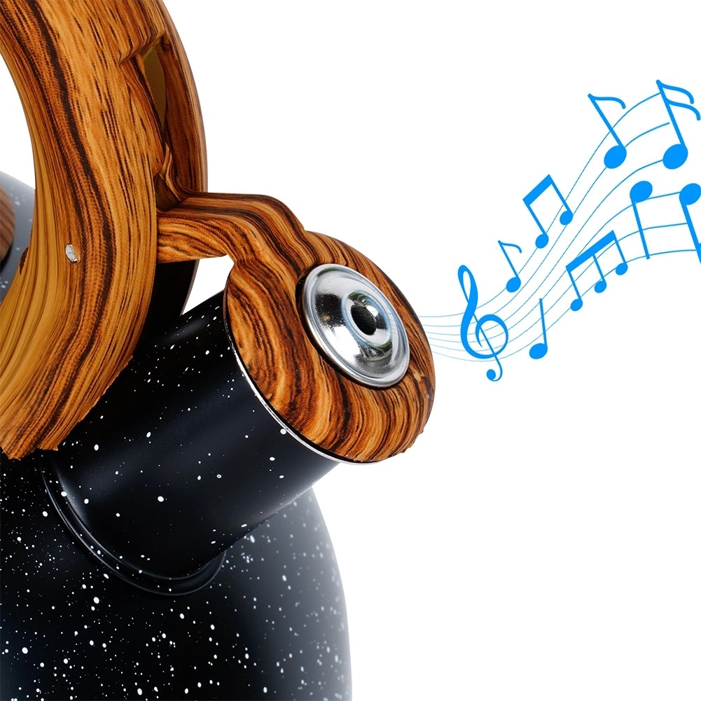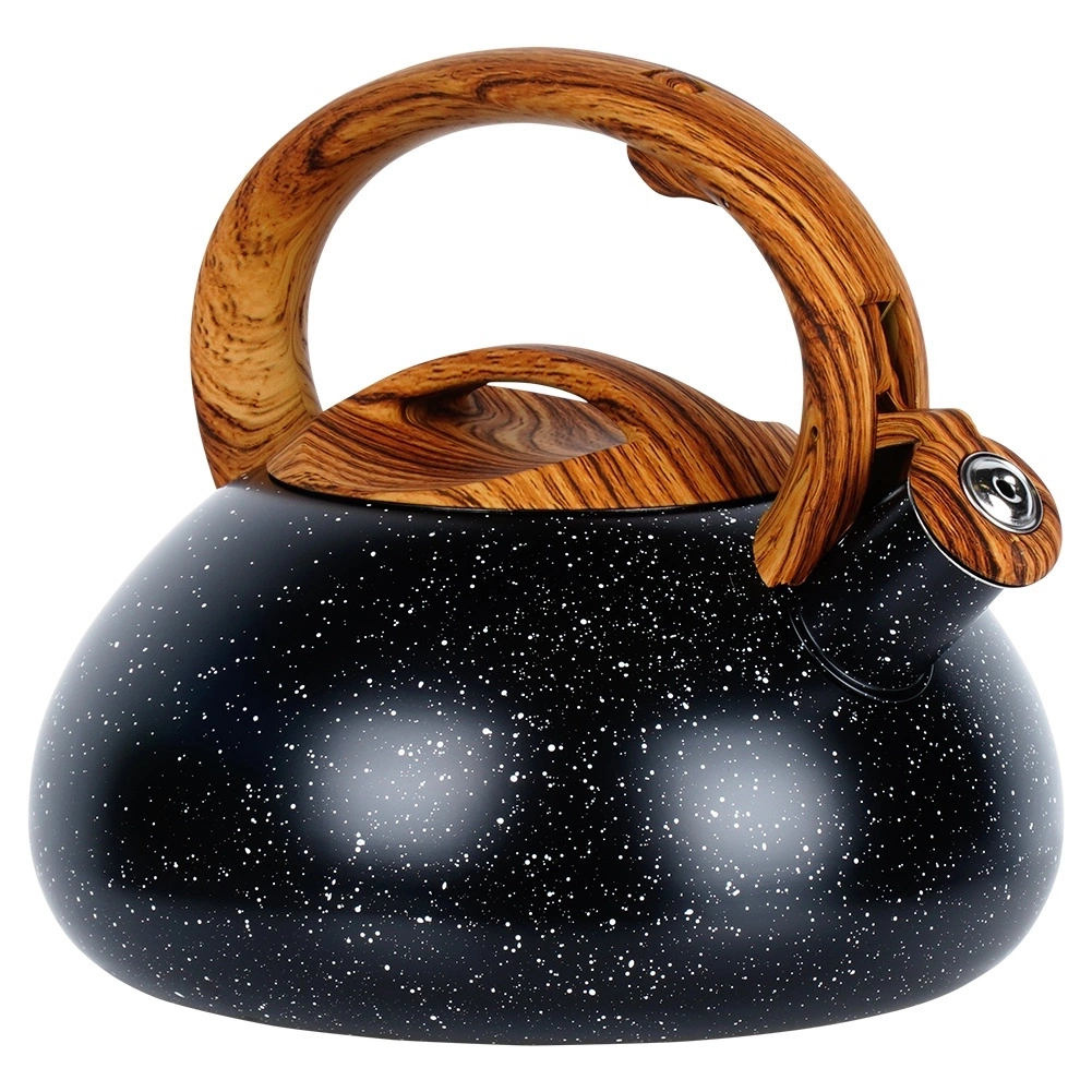 - Czajnik z automatycznym gwizdkiem. Wykonany ze stali nierdzewnej w czarnym kolorze z elementami imitującymi drewno. Do stosowania na wszystkich rodzajach kuchenek.
