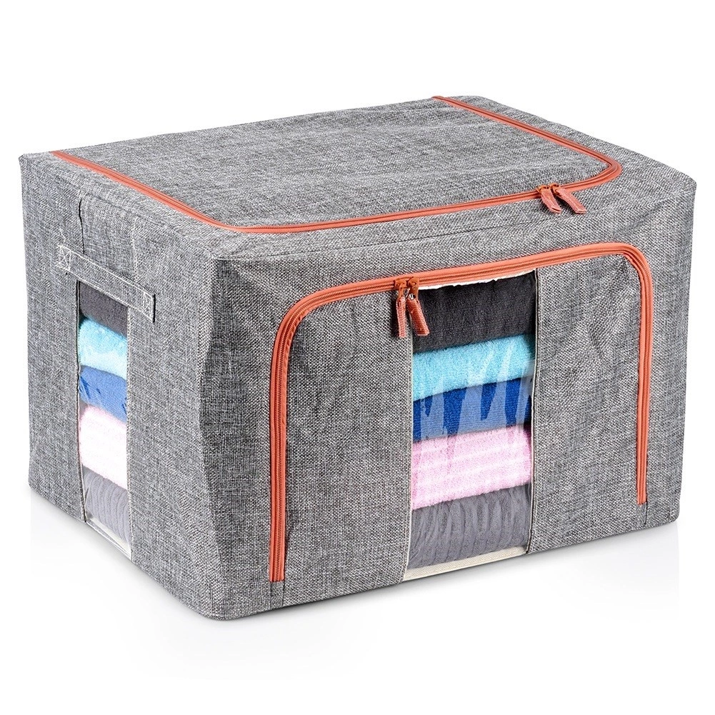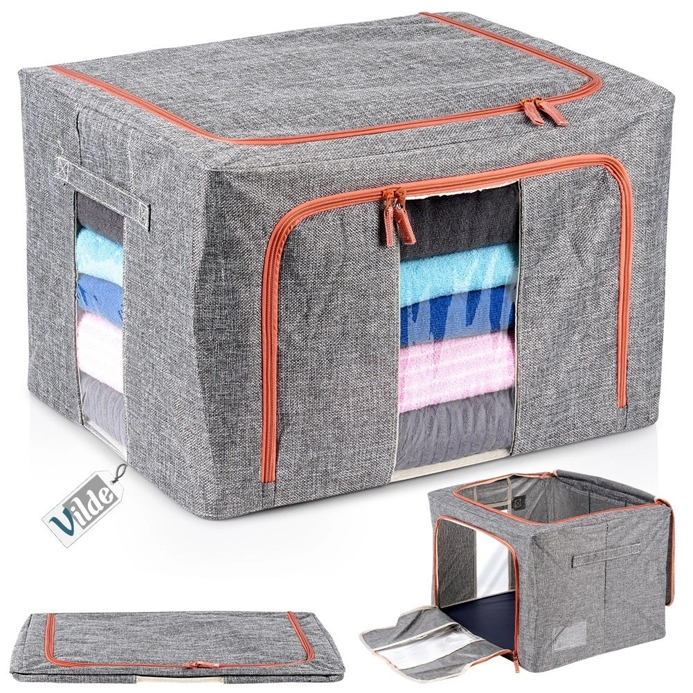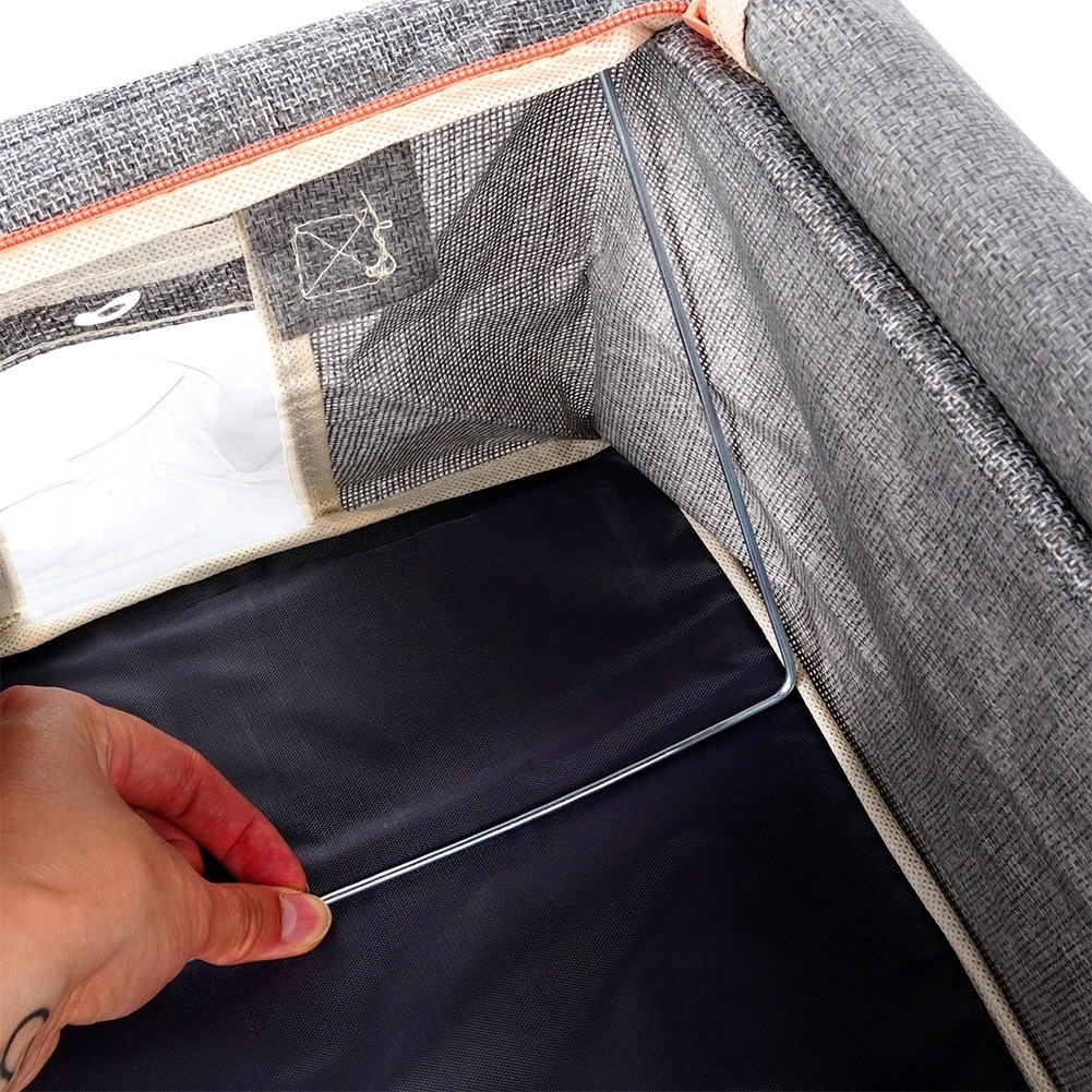 - Transparentne okienka i metalowy stelaż - Pokrowiec posiada przezroczyste okienka, umożliwiające szybki podgląd zawartości bez konieczności otwierania, co ułatwia organizację i przechowywanie. Wnętrze pokrowca posiada metalowe stelaże, które nadają mu stabilny kształt, zapobiegając zapadaniu się i ułatwiając przechowywanie ubrań oraz pościeli w estetyczny i uporządkowany sposób. Możliwość złożenia na płasko.