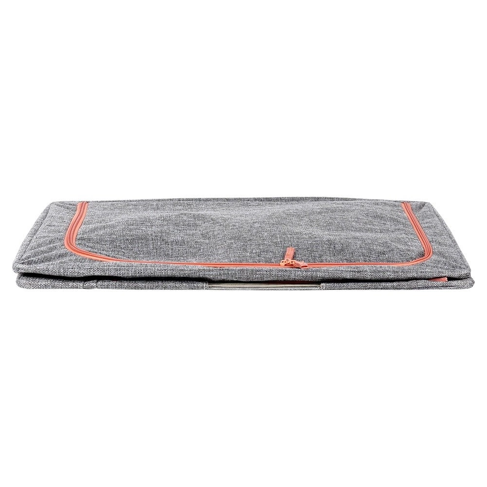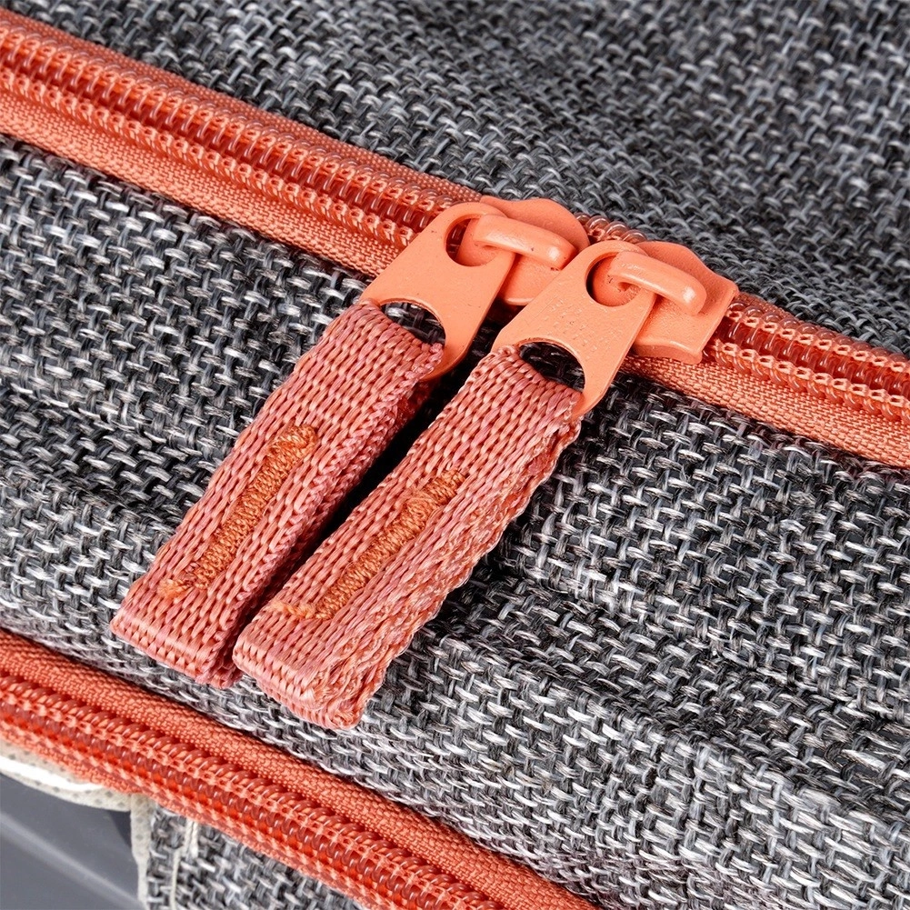 - Wysoka jakość materiału - Pokrowiec wykonany z wytrzymałej tkaniny poliestrowej w melanżowym, szarym kolorze. Zamek jest w kolorze łososiowym.