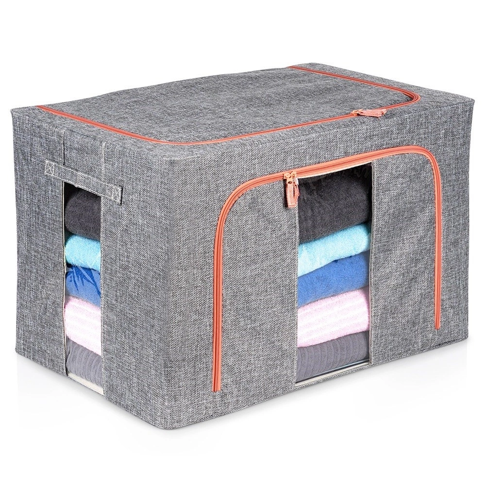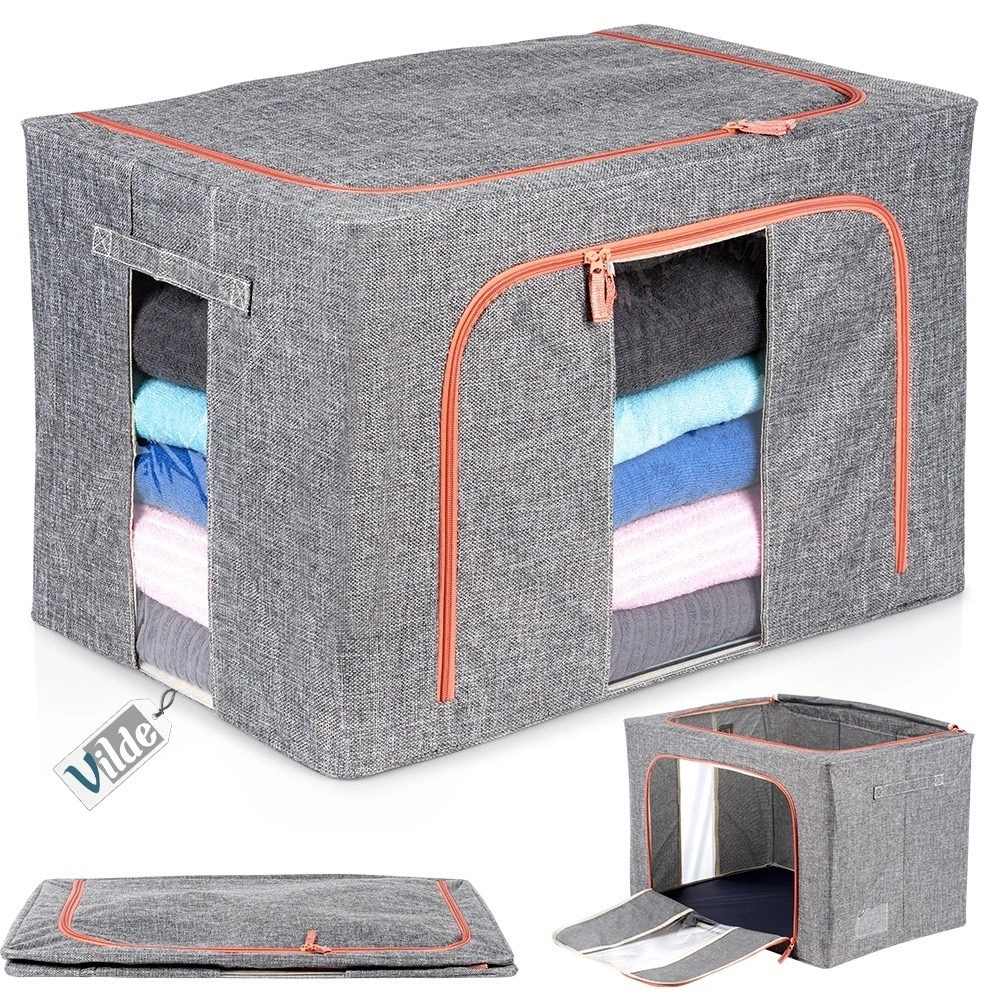 - Transparentne okienka i metalowy stelaż - Pokrowiec posiada przezroczyste okienka, umożliwiające szybki podgląd zawartości bez konieczności otwierania, co ułatwia organizację i przechowywanie. Wnętrze pokrowca posiada metalowe stelaże, które nadają mu stabilny kształt, zapobiegając zapadaniu się i ułatwiając przechowywanie ubrań oraz pościeli w estetyczny i uporządkowany sposób. Możliwość złożenia na płasko.