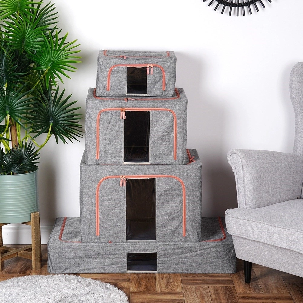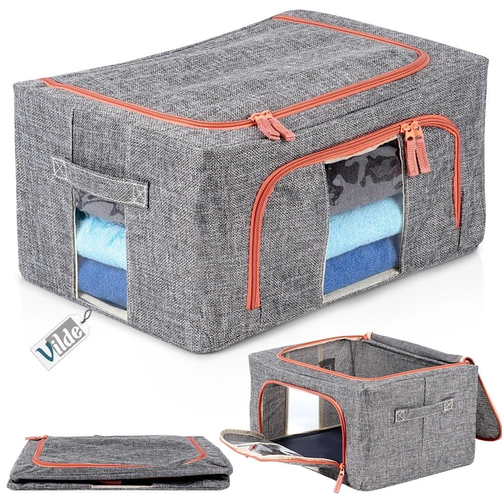 - Transparentne okienka i metalowy stelaż - Pokrowiec posiada przezroczyste okienka, umożliwiające szybki podgląd zawartości bez konieczności otwierania, co ułatwia organizację i przechowywanie. Wnętrze pokrowca posiada metalowe stelaże, które nadają mu stabilny kształt, zapobiegając zapadaniu się i ułatwiając przechowywanie ubrań oraz pościeli w estetyczny i uporządkowany sposób. Możliwość złożenia na płasko.
