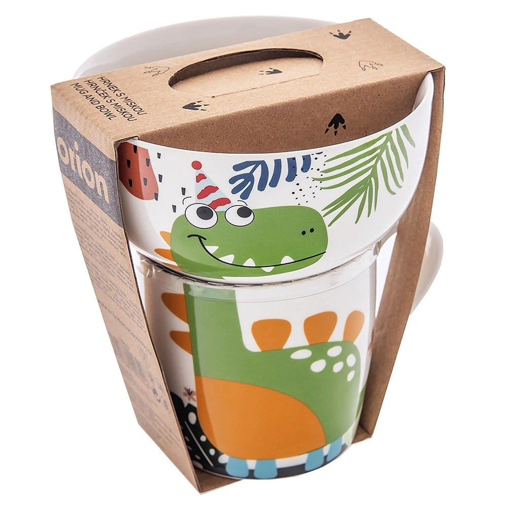 Efektowny zestaw śniadaniowy z kubkiem i miseczką ozdobiony uroczym motywem dinozaura. Zestaw ten to praktyczne rozwiązanie dla osób ceniących funkcjonalne i estetyczne akcesoria kuchenne. Świetnie sprawdzi się zarówno dla dzieci, jak i dorosłych. Idealny pomysł na prezent dla bliskich. Oryginalny produkt czeskiej marki Orion. Wyprodukowano zgodnie z europejskimi standardami.