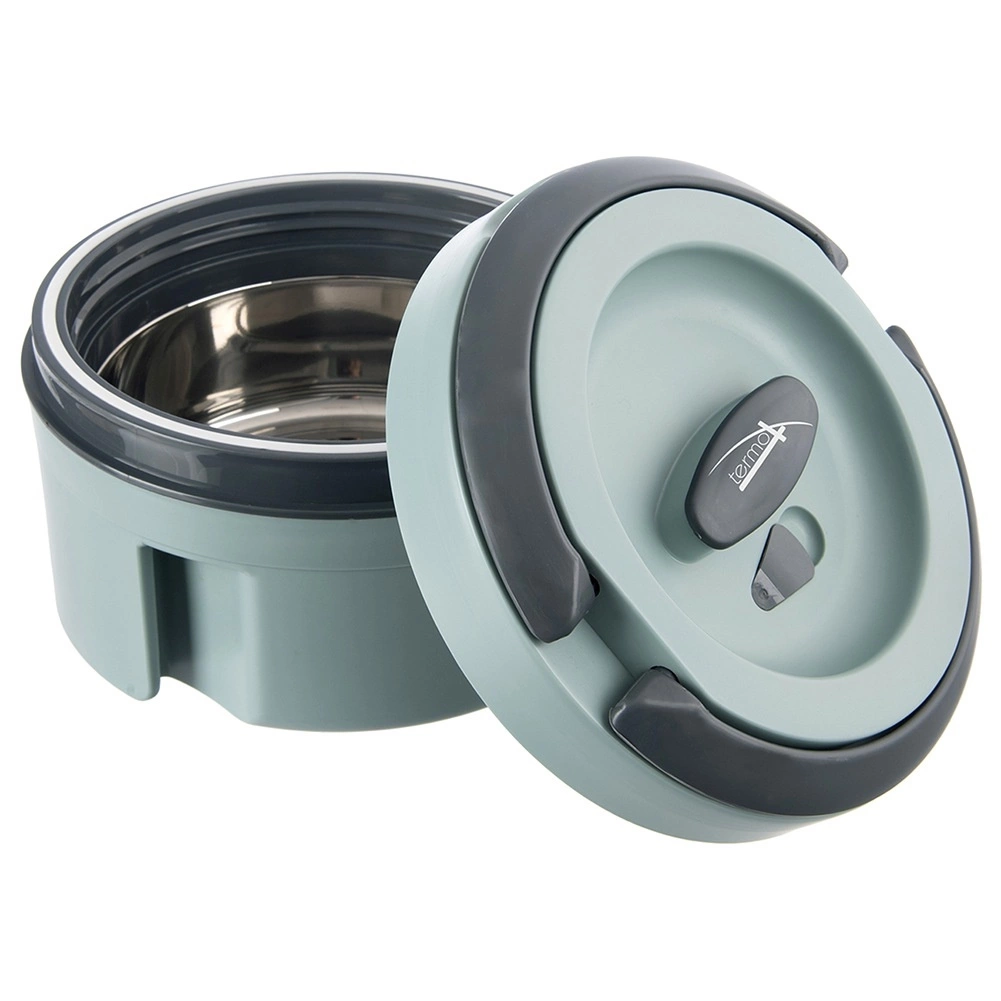 - Termos obiadowy z uszczelką i zaworem do utrzymania ciepła potraw. Latem sprawdzi się do przechowywania lodów. Z zewnątrz wykonany z tworzywa, wewnątrz ze stali nierdzewnej.