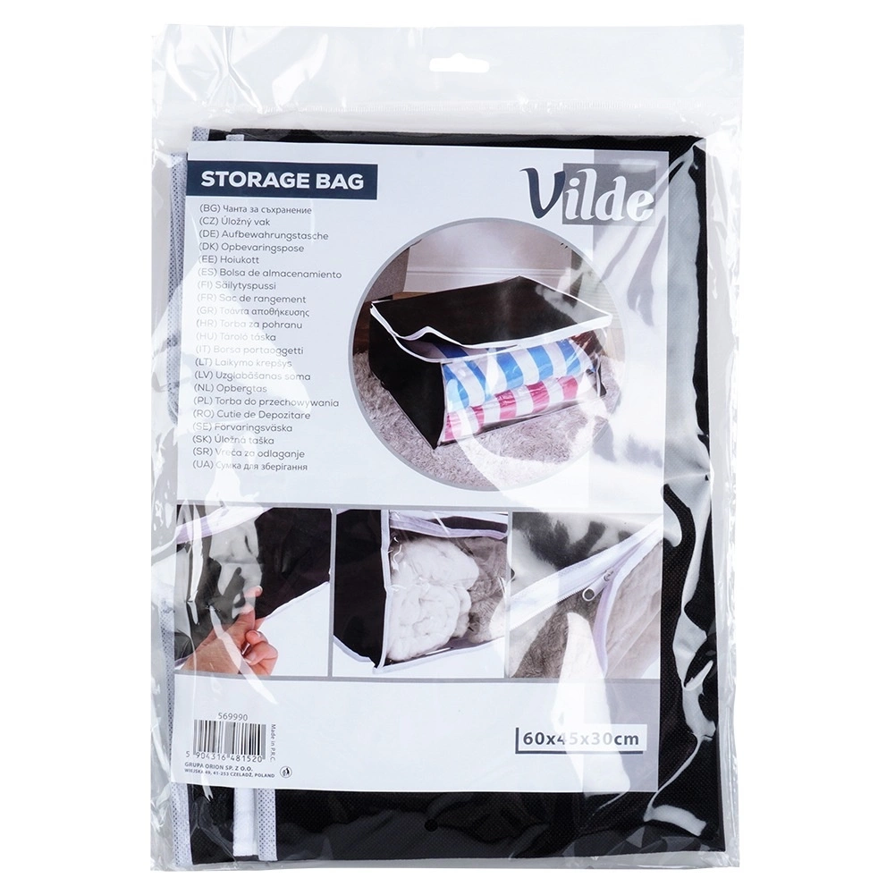 Przydatny pokrowiec na pościel. Wykonany z wytrzymałych materiałów. Sprawdzi się do przechowywania koców, poduszek, ale również ubrań i innych tekstyliów. Pokrowiec jest zamykany, więc ochroni przechowywane rzeczy przed zawilgoceniem oraz molami. Z jego pomocą możemy odpowiednio wygospodarować przestrzeń w szafie lub pod łóżkiem. Oryginalny produkt marki Vilde. Wyprodukowano zgodnie z europejskimi standardami.