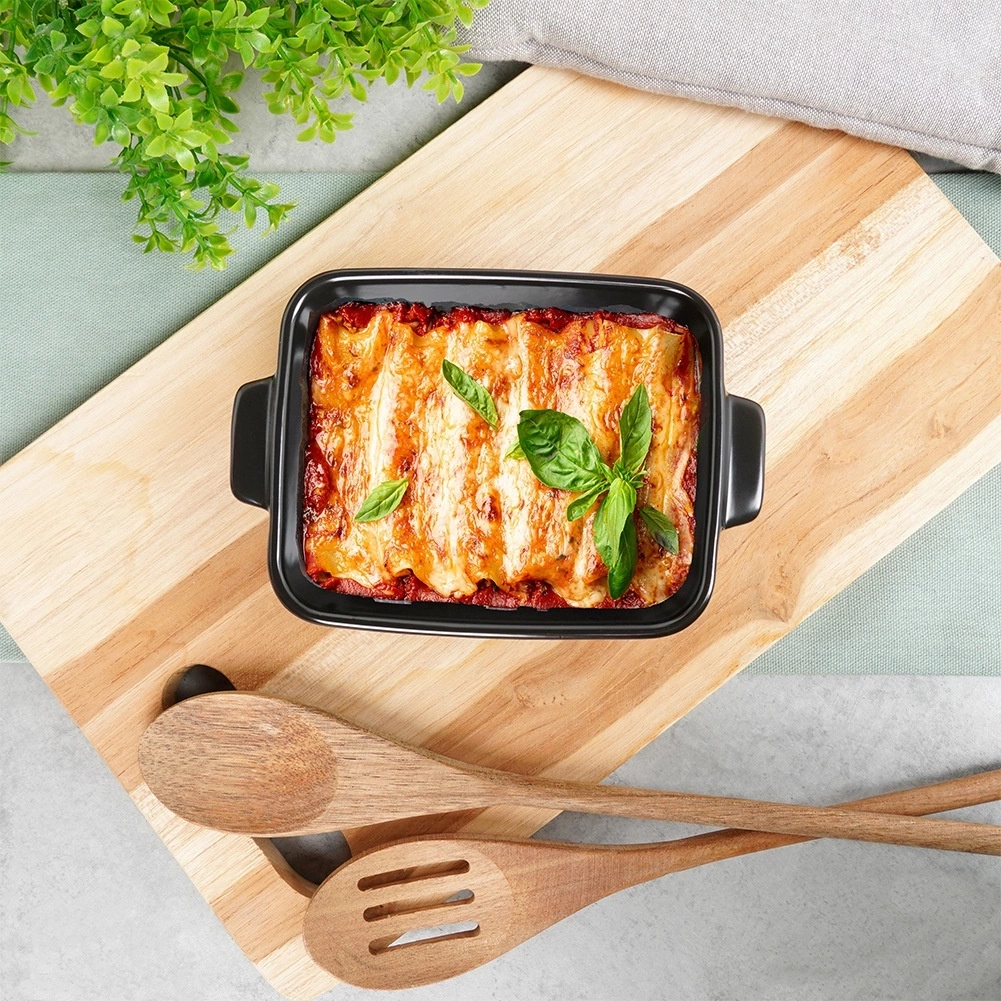 - Żaroodporne naczynie do zapiekania lasagne, ziemniaków, pieczonych warzyw, zapiekanek, deserów itp. Naczynie wykonane z ceramiki w czarnym kolorze.