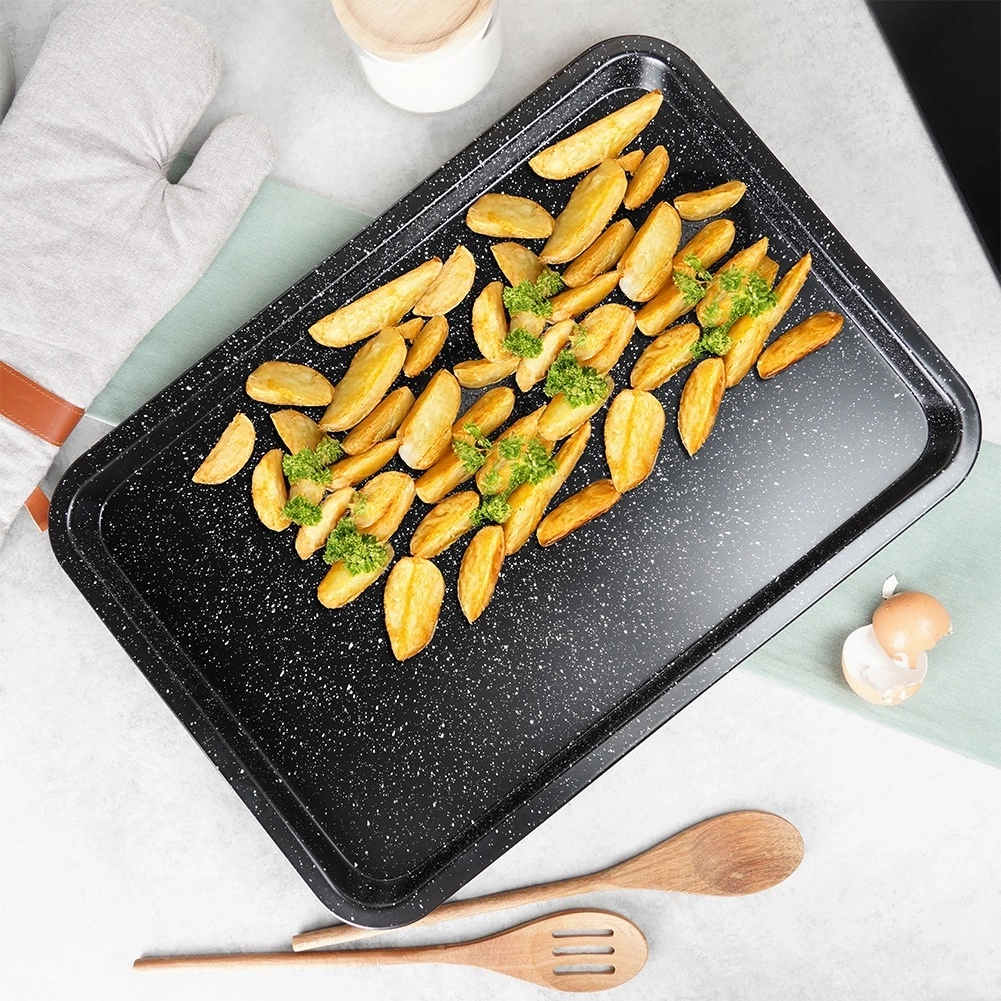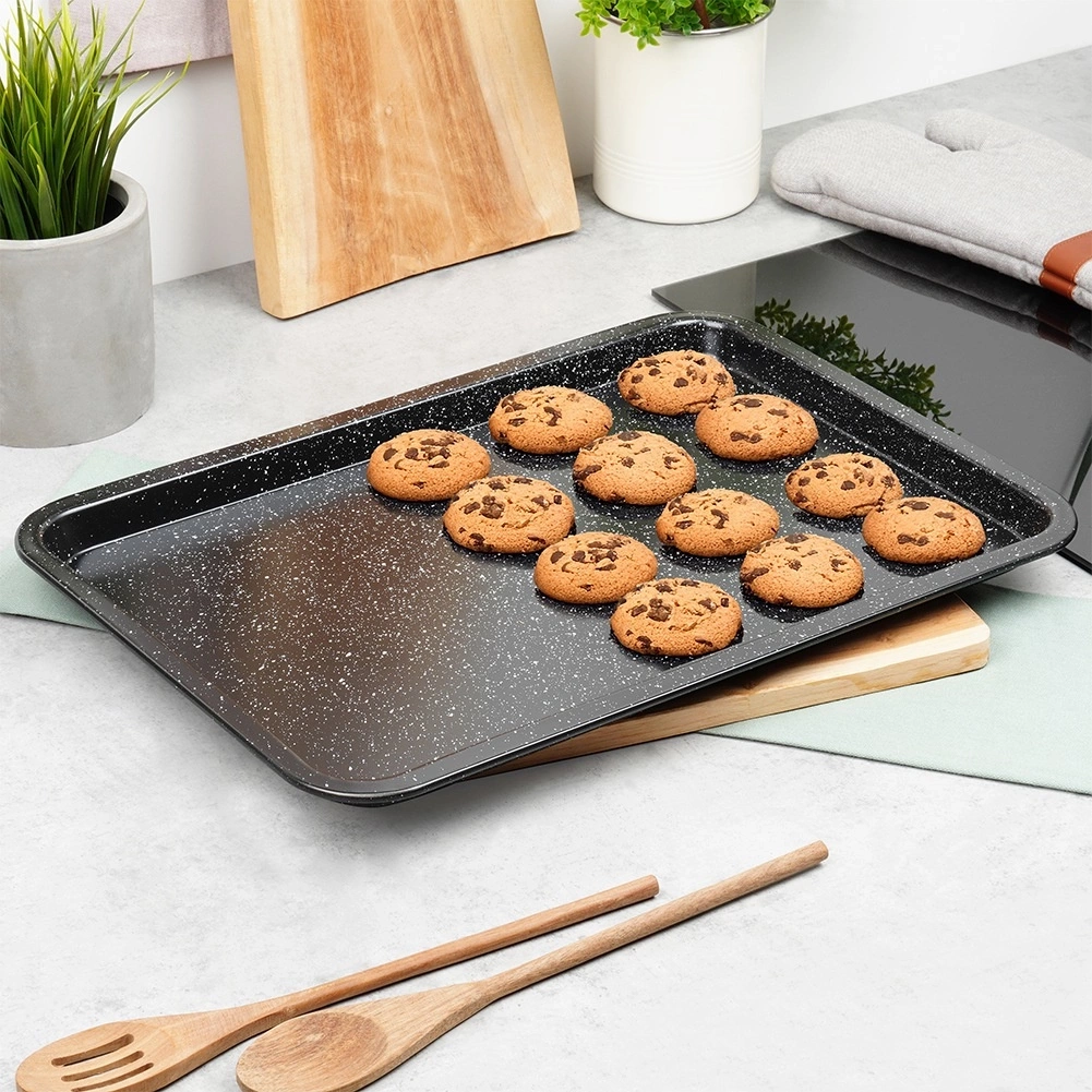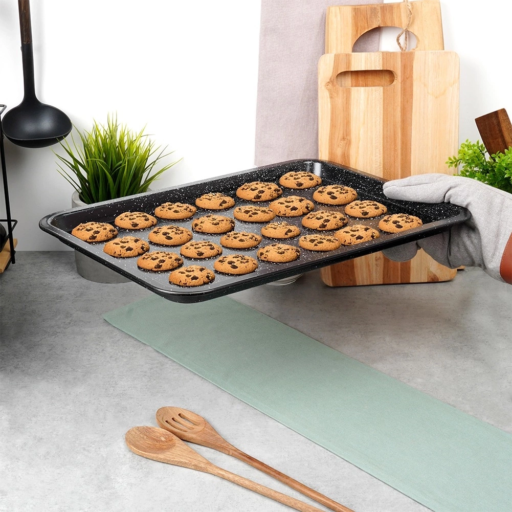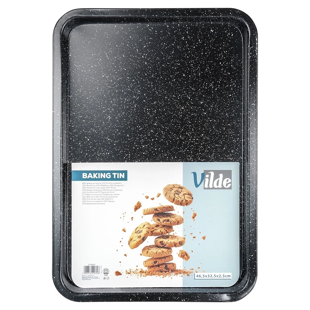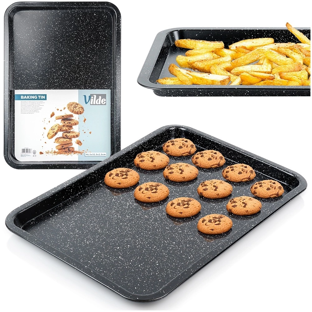 Duża blacha do pieczenia z powłoką granitową, znajdzie szerokie zastosowanie w kuchni. Łatwa w czyszczeniu i wygodna w użytkowaniu. Idealna do pieczenia słodkich i słonych potraw. Wykonana z najwyższej jakości materiałów, co zapewni komfort użytkowania. Oryginalny produkt marki Vilde. Wyprodukowano zgodnie z europejskimi standardami.