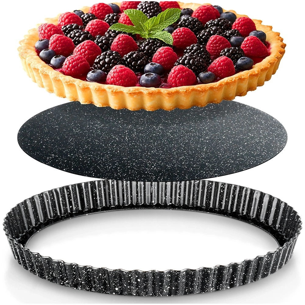 - Okrągła forma do tarty o średnicy 28 cm z wyjmowanym dnem. Wykonana ze stali węglowej z powłoką granitową. Idealna do przygotowania tart wytrawnych, jak i słodkich.