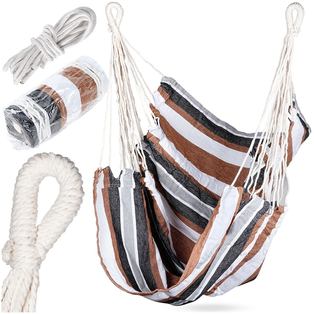 - Hamak brazylijski do zawieszenia - Solidny i wygodny hamak brazylijski w formie podwieszanego fotela. Idealny do ogrodu jak również na balkon, taras, do altany czy nawet w domu. Wymiar materiału tworzącego hamak wynosi 96 x 130 cm w zestawie sznurki mocujące.