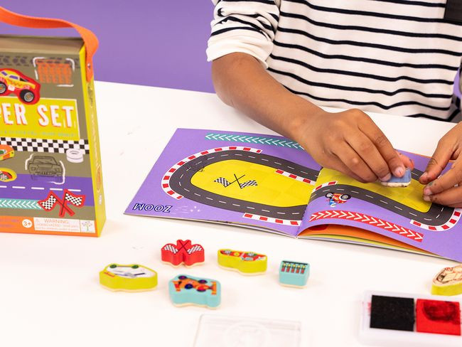 Ciesz się mnóstwem zabawy z zestawem Samochody od marki Floss & Rock! Stwórz własne sceny i opowiadaj historie z pomocą 8 zabawnych pieczątek, 4 kolorowych poduszek z tuszem oraz 24-stronicowej książeczki w pełnym kolorze, wszystko przechowywane w praktycznej walizce z wysuwanym szufladką. Zestaw zawiera wiele samochodów wyścigowych, motocykli, ciężarówek i innych pojazdów. Otwórz 24-stronicową książeczkę, aby znaleźć gotowe sceny do dekorowania i wykorzystaj dostępne stempelki oraz tusze do tworzenia kreatywnych opowieści oraz fantastycznych scenek.