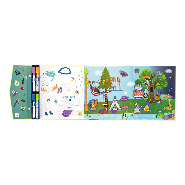 Układaj puzzle, rysuj, koloruj i baw się! Zestaw Magnetyczny Przygoda to cztery lubiane i popularne zabawy w jednym pudełku, które gwarantują dzieciom świetną i kreatywną zabawę na wiele godzin. Po rozłożeniu zestawu odsłania się atrakcyjną układankę składającą się z 20 magnetycznych elementów, 4 kolorowe pisaki z gumkami do wycierania na sucho oraz plansze do rysowania i pisania. Zestaw zawiera także magnetycznego łosia, niedźwiedzia obserwującego gwiazdy, wiewiórkę grającą w karty oraz ptaki, owady i żaby, co umożliwia niekończącą się zabawę na planszy magnetycznej. Pudełko składa się na płasko i jest wyposażone w poręczny uchwyt do przenoszenia, dzięki czemu idealnie sprawdza się w podróży oraz do zabawy na świeżym powietrzu.
