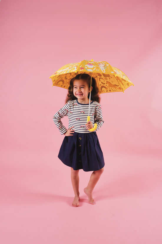 Zapewnij swojemu dziecku niezapomniane przygody podczas spacerów w deszczu dzięki magicznej parasolce zmieniającej kolory! Za każdym razem, gdy deszcz zaczyna padać, białe kształty na parasolce magicznie wypełniają się kolorowymi motywami tęczowych wróżek, rozweselając nawet najbardziej pochmurny dzień. Gdy parasolka wysycha, kolory wracają do bieli. W komplecie znajduje się wygodne zapięcie na rzep, które zabezpiecza złożoną parasolkę.