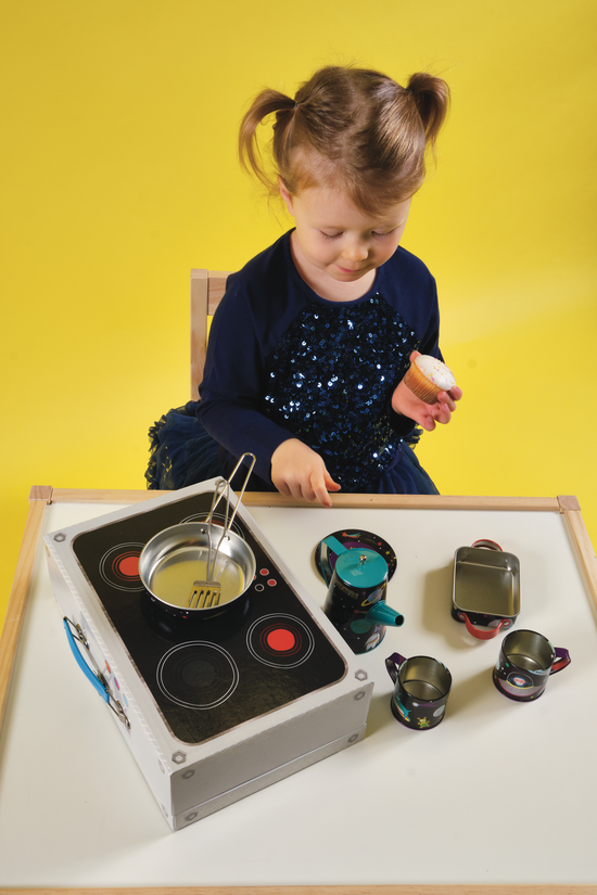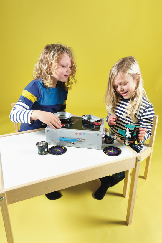Zestaw do herbaty Kosmos ozdobiony wspaniałymi, kolorowymi ilustracjami z motywem kosmosu to gwarancja świetnej zabawy! W kolorowej metalowej walizeczce, która może służyć jako płyta do gotowania, znajdują się: dwie filiżanki, dzbanek do kawy z pokrywką, dwa talerze, patelnię, naczynie do piekarnika, trzepaczkę i łopatkę. Zestaw herbaciany pozwala na zabawę w dom i odgrywanie ról, stanowiąc również świetną propozycję zabawy dla grupy dzieci. Uczy umiejętności społecznych i nawiązywania relacji. Walizeczka wyposażona jest w poręczny uchwyt, dzięki czemu można je łatwo przenosić z miejsca na miejsce.