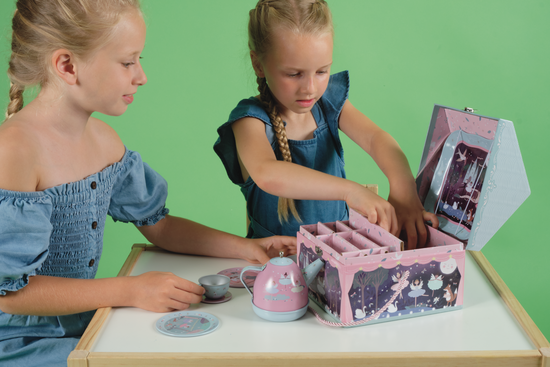 Zestaw do herbaty Baletnice ozdobiony wspaniałymi, kolorowymi ilustracjami z motywem baletnic to gwarancja świetnej zabawy! Znajdziesz w nim grający dzbanek do herbaty, tacę, dwie łyżki, dwie filiżanki, dwa spodki i dwa talerzyki. Melodia z „Jeziora łabędzi” będzie towarzyszyła podczas nalewania herbatki. Zestaw herbaciany pozwala na zabawę w dom i odgrywanie ról, stanowiąc również świetną propozycję zabawy dla grupy dzieci. Uczy umiejętności społecznych i nawiązywania relacji. Walizeczka wyposażona jest w poręczny uchwyt, dzięki czemu można je łatwo przenosić z miejsca na miejsce.