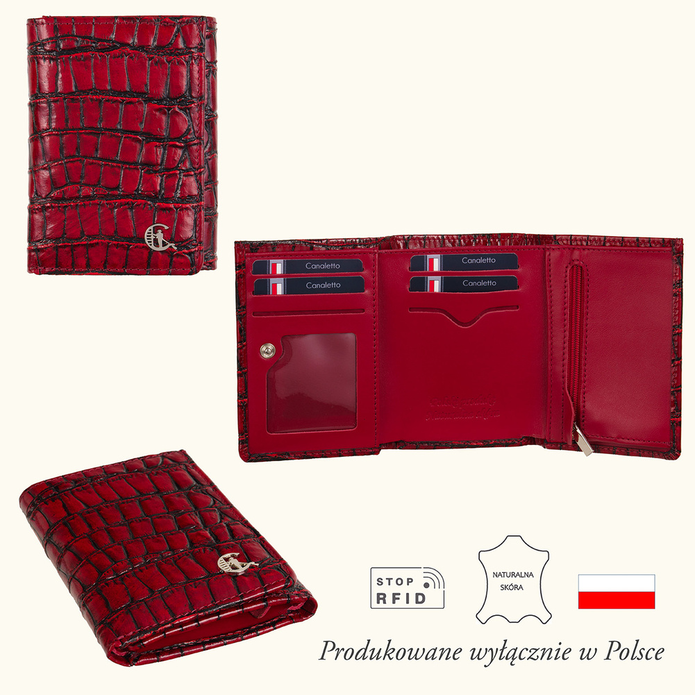 - Mały portfel Canaletto ze skóry tłoczonej na wzór krokodyla. 6 miejsc na karty, przegroda na banknoty, kieszeń na monety i zdjęcie. Styl i funkcjonalność.