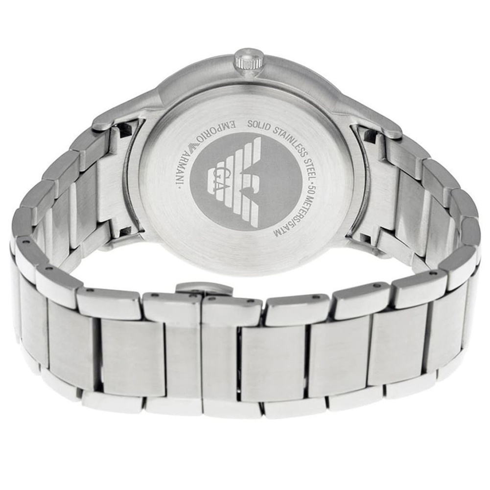 Męski zegarek Emporio Armani Renato AR2472 to klasyczny męski zegarek, idealny zarówno do eleganckiego ubioru, jak i do noszenia na co dzień. Koperta oraz bransoleta zostały wykonana ze stali szlachetnej, co gwarantuje jej wieloletnią odporność na zniszczenie. Na granatowej tarczy zabezpieczonej mineralnym szkłem znajdziemy datownik wskazujący dzień miesiąca.