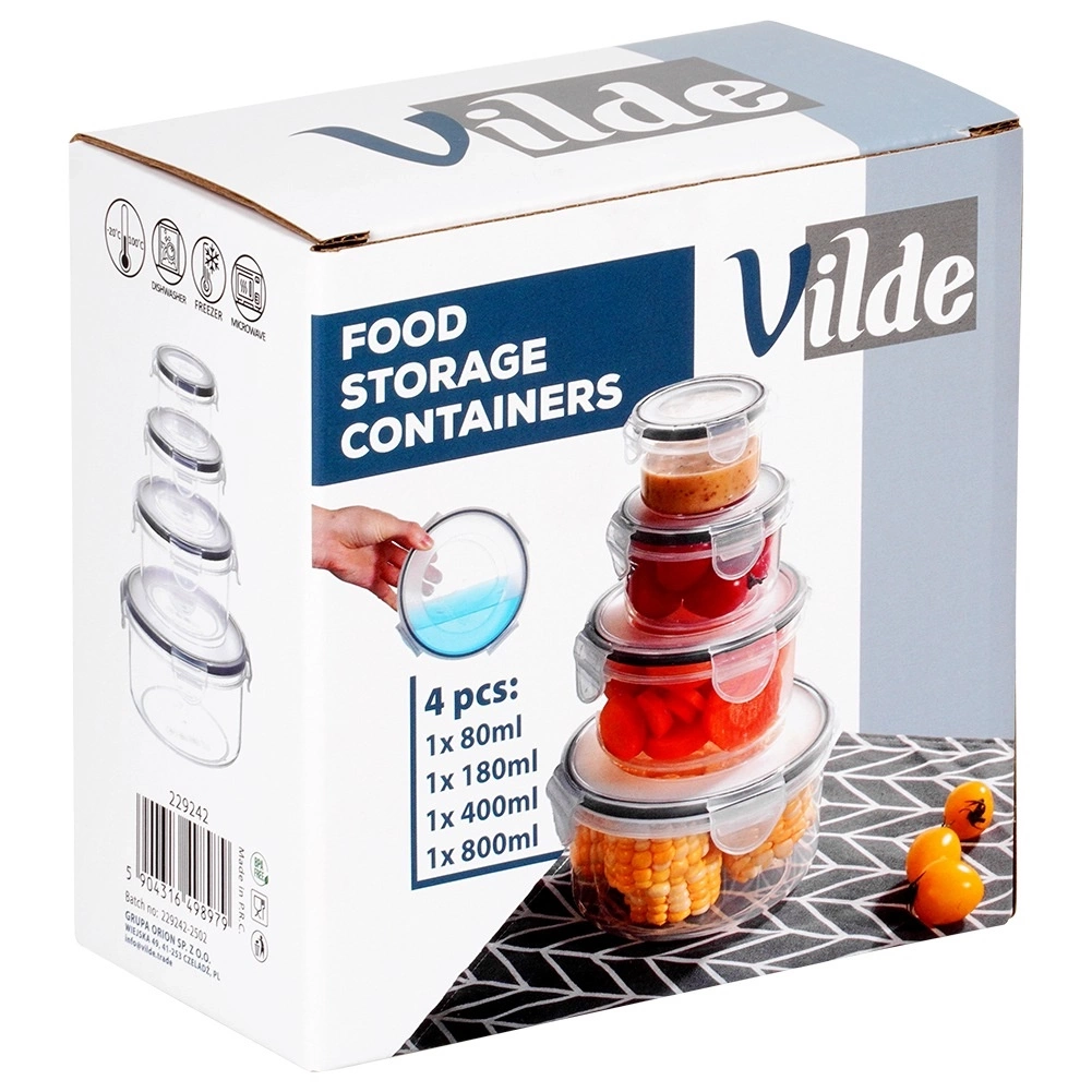 Zestaw pojemników kuchennych w różnych rozmiarach. W zestawie: 1x pojemnik o średnicy 14 cm, wysokości 7,5 cm i pojemności 800 ml, 1x pojemnik o średnicy 11 cm, wysokości 6,5 cm i pojemność 400 ml, 1x pojemnik o średnicy 8,5 cm, wysokości 5 cm i pojemności 180 ml, 1x pojemnik o średnicy 6,5 cm, wysokości 4 cm i pojemności 80 ml. Przydatne w każdej kuchni. Pozwolą na odpowiednie przechowywanie produktów, wprowadzając ład i porządek do kuchni. Oryginalny produkt marki Vilde. Wyprodukowano zgodnie z europejskimi standardami.