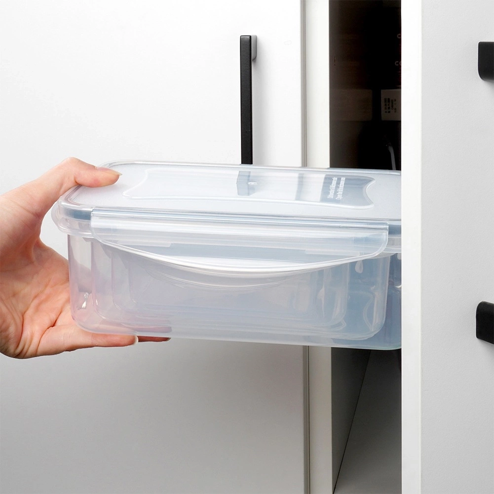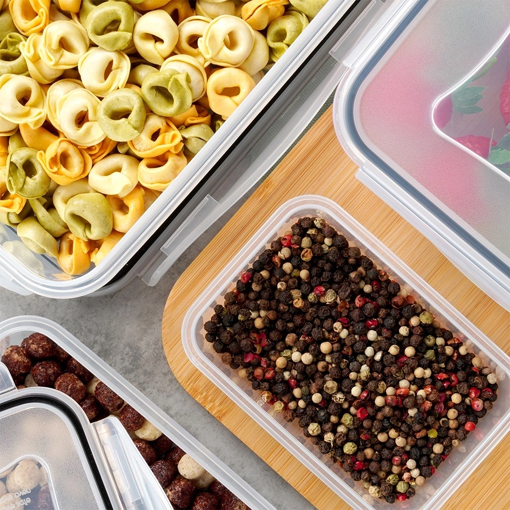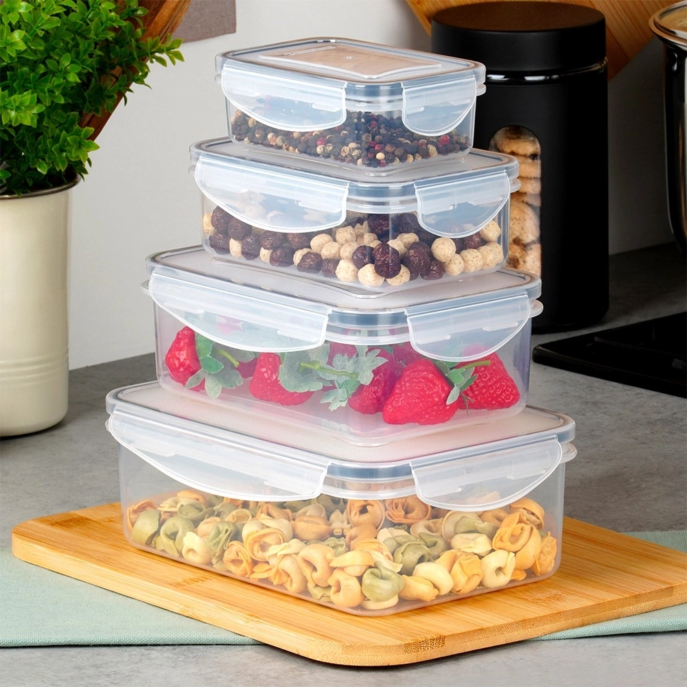 - Zestaw 4 pojemników na żywność - Zestaw 4 szt. pojemników kuchennych z pokrywkami do przechowywania żywności i produktów sypkich. W zestawie prostokątne pojemniki w czterech różnych rozmiarach (1,5 l, 1 l, 500 ml i 240 ml). Pojemniki można wygodnie przechowywać umieszczając je w największym pojemniku.