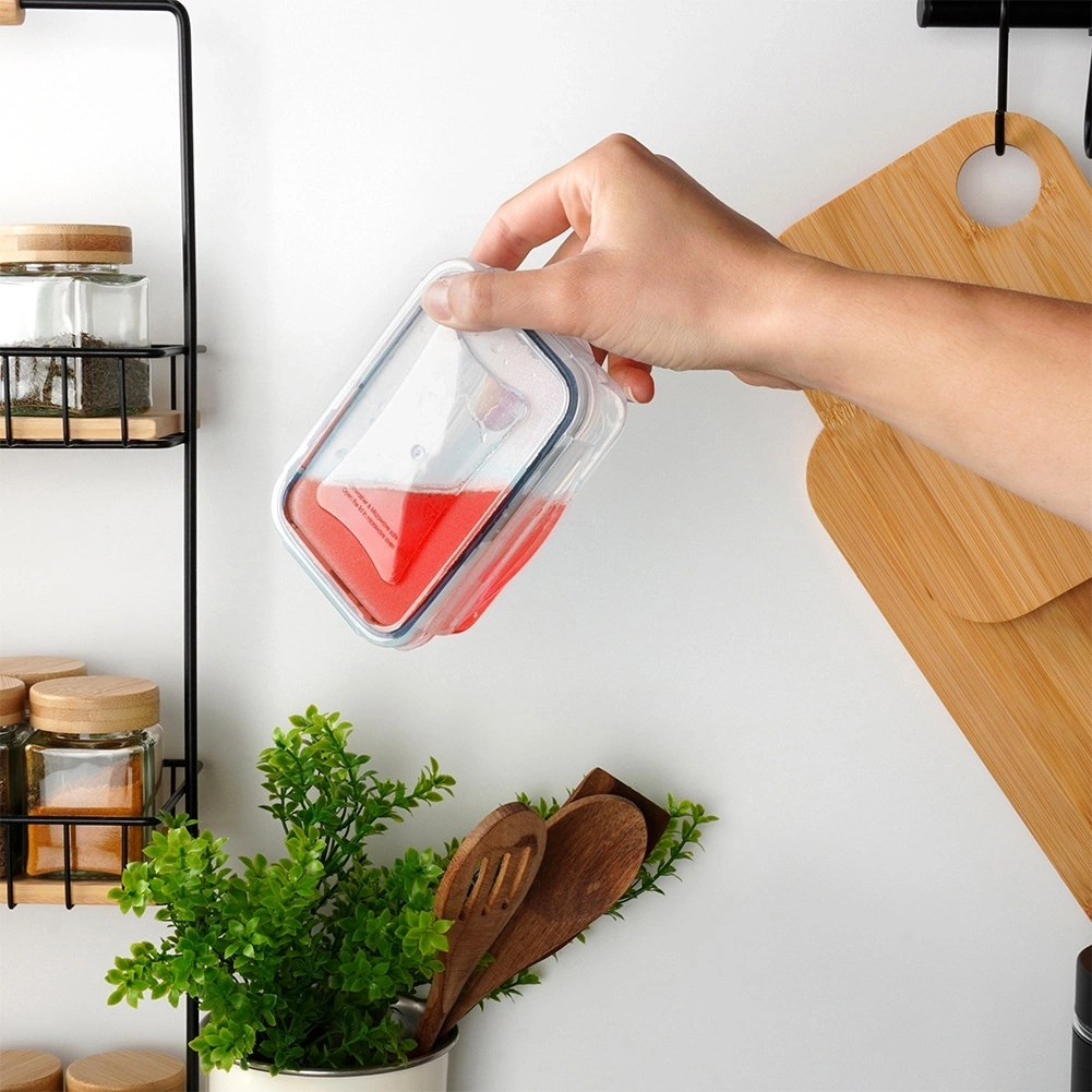 - Solidnie wykonane - Pojemniki wykonane z tworzywa w przezroczystym kolorze. Pokrywka wykonana również z przezroczystego tworzywa, posiada silikonową uszczelkę w kolorze czarnym. Przezroczysty kolor pozwoli na wygodne sprawdzenie zawartości pojemnika, bez konieczności otwierania go. Bezpieczne dla zdrowia i neutralne dla żywności - nie posiadają szkodliwego BPA (bisfenolu).