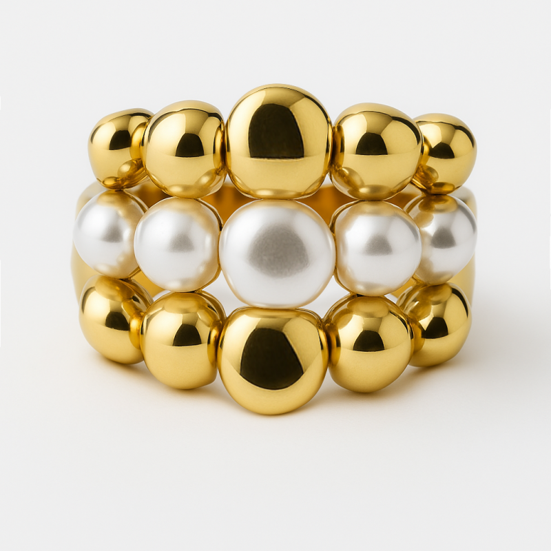 Nowa kolekcja biżuterii ze stali szlachetnej Pierścionek platerowany 14-karatowym złotem Rozmiar: regulowany, pasuje na R6/ R7 Szerokość: 1,8cm Waga: 17g