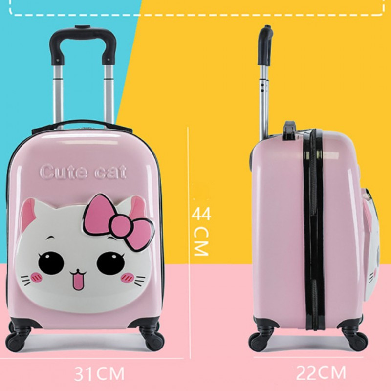 STYLOWA DZIECIĘCA WALIZKA PODRÓŻNA NA KÓŁKACH Walizka posiada wysuwaną rączkę teleskopową i zamek szyfrowy, wyposażona jest w cztery koła 360 st odporne na obciążenie. Dwuczęściowa komora chroni bagaż przed zniszczeniem, środek walizki jest całościowo wyłożony podszewką. Walizka dodatkowo wyposażona jest w pasy zabezpieczające wewnątrz, zapinana na dwustronny zamek błyskawiczny. Idealnie nadaje się do samolotu, będzie przydatna na wszelkiego typu wycieczki, wyjazdy wakacyjne, szkolne, czy przedszkolne wyprawy. Walizka została wykonana z tworzywa z ABS, wytrzymałego na uszkodzenia poliwęglanu. Wymiary: Szerokość: 31 cm Głębokość: 22 cm Wysokość z kółkami: 44 cm Wysokość z rączką: 74 cm Waga z opkowaniem: 2,63 kg