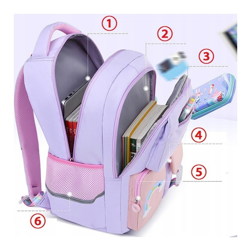 Specyfikacja:- Dwie główne komory pomieszczą książki o standardowych rozmiarach;- Trzy przednie kieszenie są idealne na przybory szkolne, przekąski lub inne małe