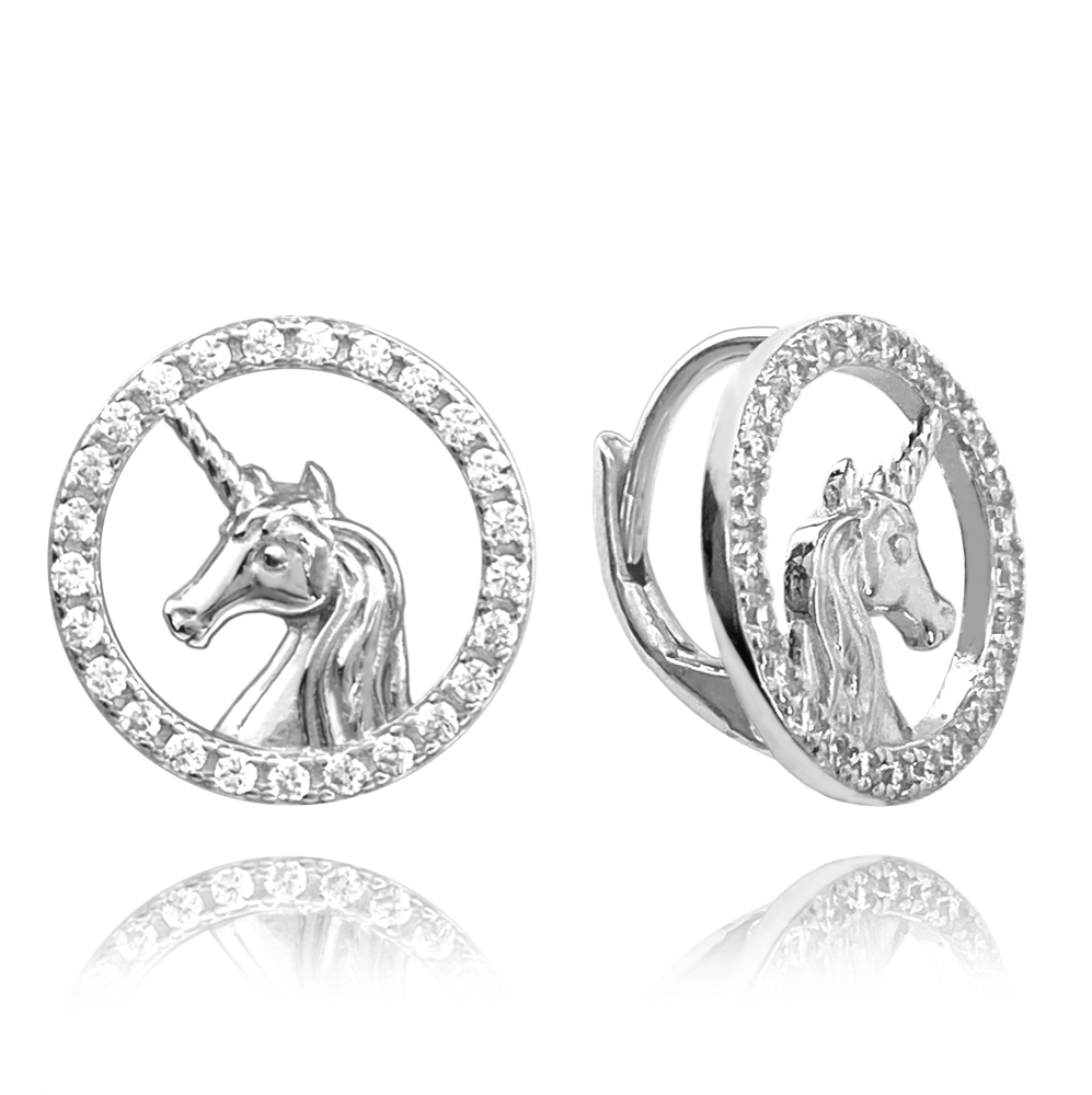 MINET Błyszczące dziecięce srebrne kolczyki JEDNOROŻCE z białymi cyrkoniami