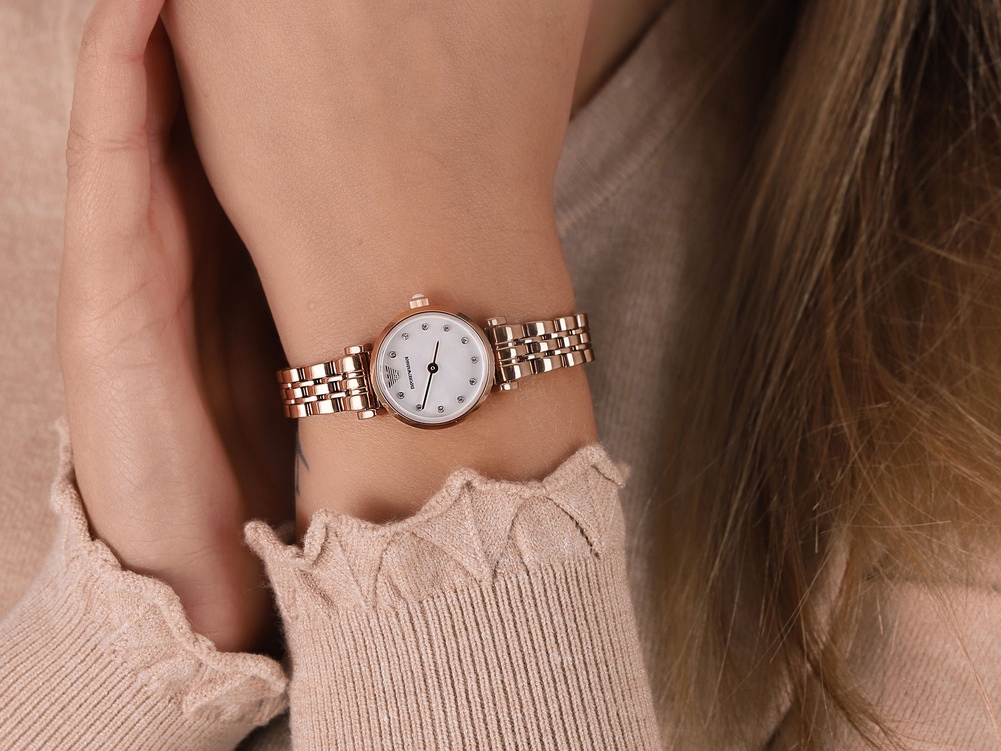 Zegarek Emporio Armani Gianni T-Bar AR11203 to elegancki damski czasomierz, idealny zarówno do eleganckiego ubioru, jak i do noszenia na co dzień. Model posiada dokładny mechanizm kwarcowy zasilany baterią. Tarczę w kolorze białym z fakturą macicy perłowej i ozdobioną cyrkoniami zabezpiecza odporne na zarysowania szkło mineralne.