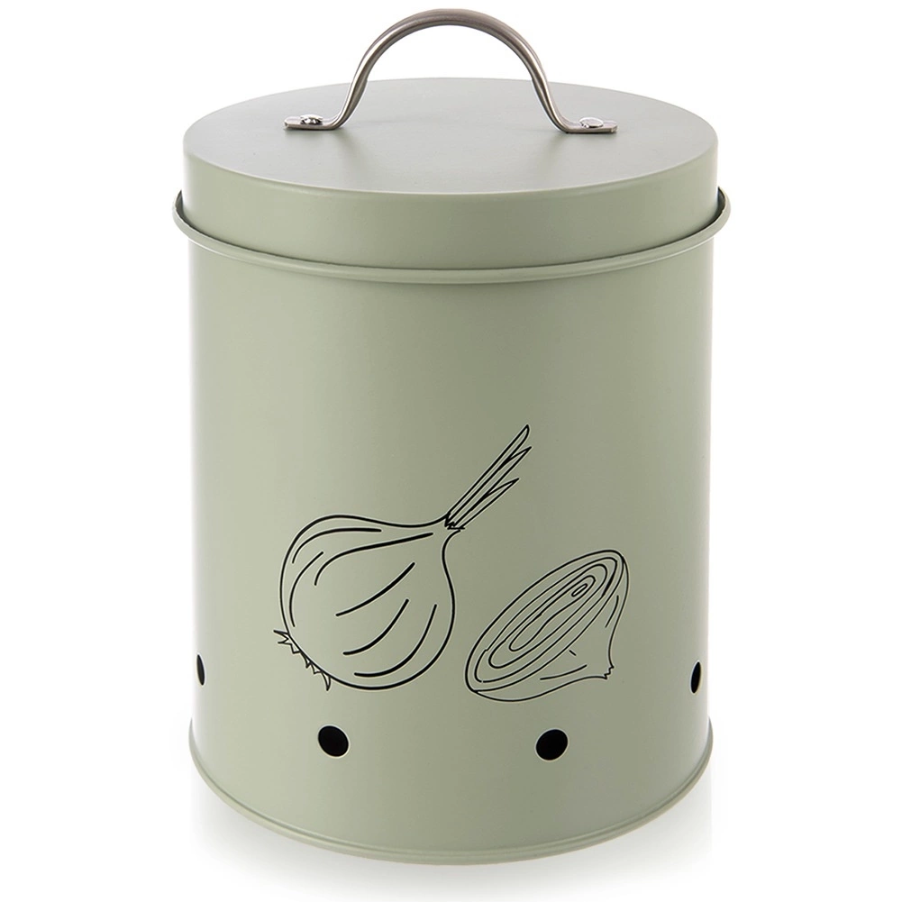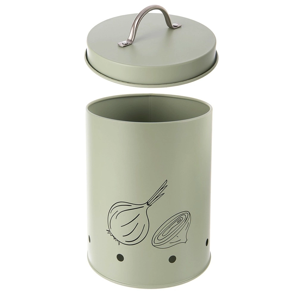 - Metalowy pojemnik z pokrywką do przechowywania cebuli lub innych warzyw. Posiada otwory wentylacyjne, które zapewniają cyrkulację powietrza i przedłużają trwałość warzyw.