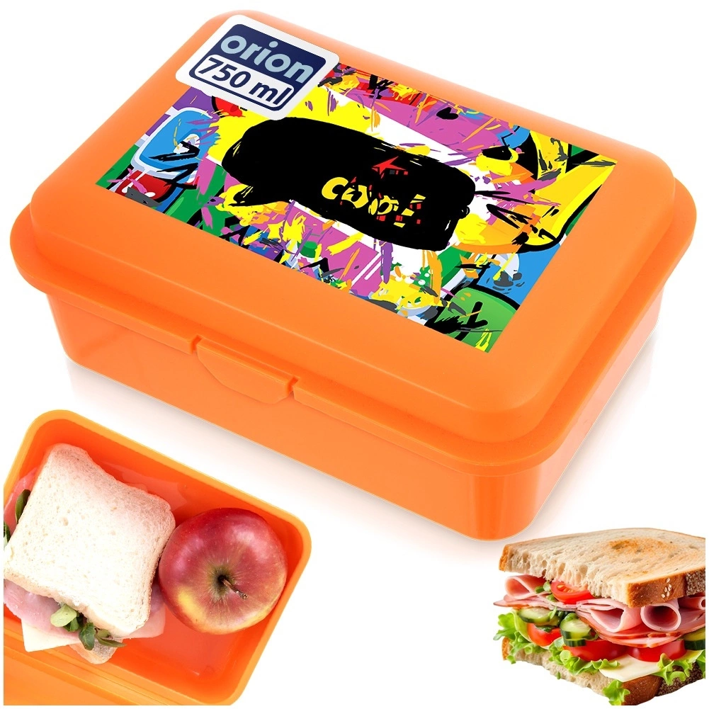 - Pojemnik śniadaniowy zamykany na klips. Wykonany z wysokiej jakości tworzywa w kolorze pomarańczowy z kolorowym nadrukiem. Posiada jedną przegródkę.