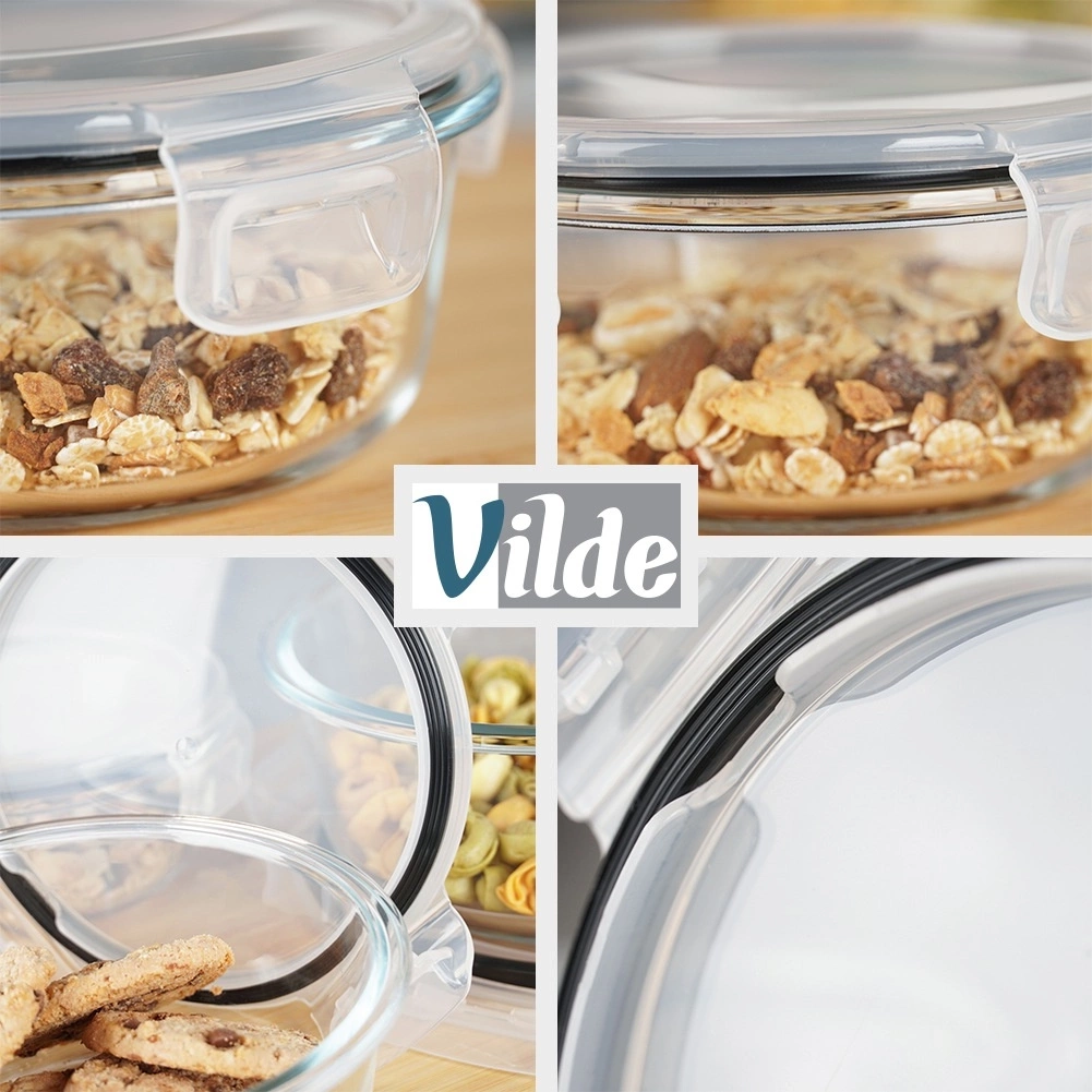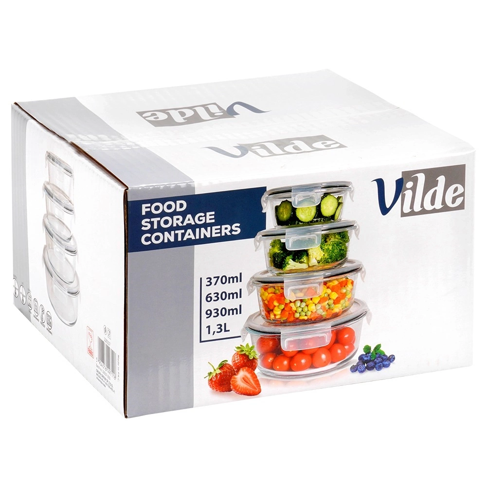 Zestaw pojemników kuchennych w różnych rozmiarach. W zestawie: 1x pojemnik o średnicy 19 cm, wysokości 8 cm i pojemności 1,3 l, 1x pojemnik o średnicy 17 cm, wysokości 7 cm i pojemności 930 ml, 1x pojemnik o średnicy 15 cm, wysokości 6,5 cm i pojemności 630 ml, 1x pojemnik o średnicy 13 cm, wysokości 6 cm i pojemności 370 ml. Przydatne w każdej kuchni. Pozwolą na odpowiednie przechowywanie produktów, wprowadzając ład i porządek do kuchni. Oryginalny produkt marki Vilde. Wyprodukowano zgodnie z europejskimi standardami.