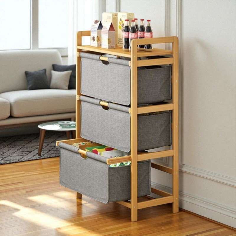 bambusowy regał z lekkimi materiałowymi szufladami, dzięki któremu łatwo uporządkujesz swoje rzeczy.
