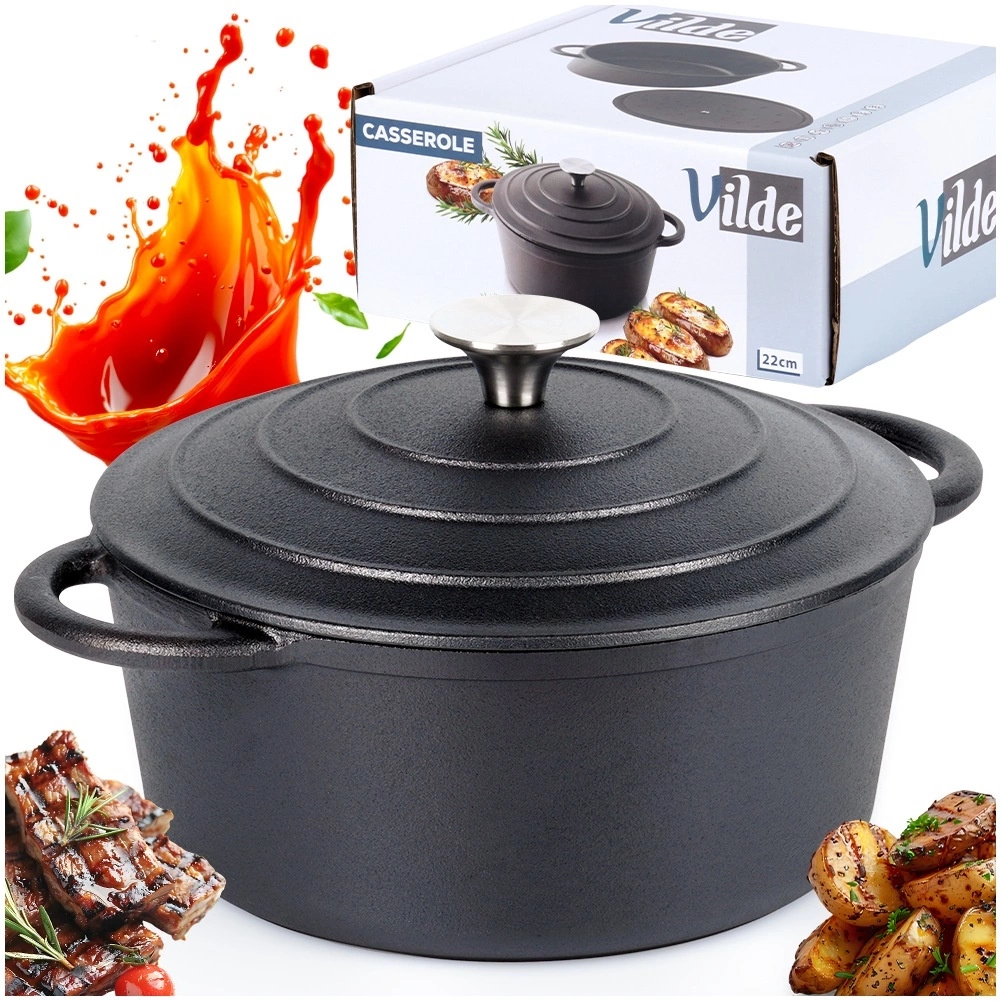 Garnek żeliwny z pokrywką przydatny w każdym domu. Idealny do gotowania, pieczenia, duszenia oraz smażenia potraw. Potrawy przygotowane w garnku będą soczyste i aromatyczne. Możemy użytkować ją w każdej kuchence, ale również bezpośrednio na grillu, czy ogniu. Żeliwo rozgrzewa się równomiernie i długo utrzymuje ciepło, dzięki czemu serwowane dania dłużej będą ciepłe. UWAGA! Po każdym użyciu umyć, wytrzeć suchą szmatką do sucha i natłuścić - w przeciwnym razie na naczyniu pojawi się rdza, co jest naturalnym procesem dla tego typu materiału. Naczynie nie posiada żadnych powłok typu "teflon". Regularna pielęgnacja zapobiega korozji i zapewnia długotrwałe użytkowanie naczynia. Oryginalny produkt marki Vilde z linii Cast Line. Wyprodukowano zgodnie z europejskimi standardami.