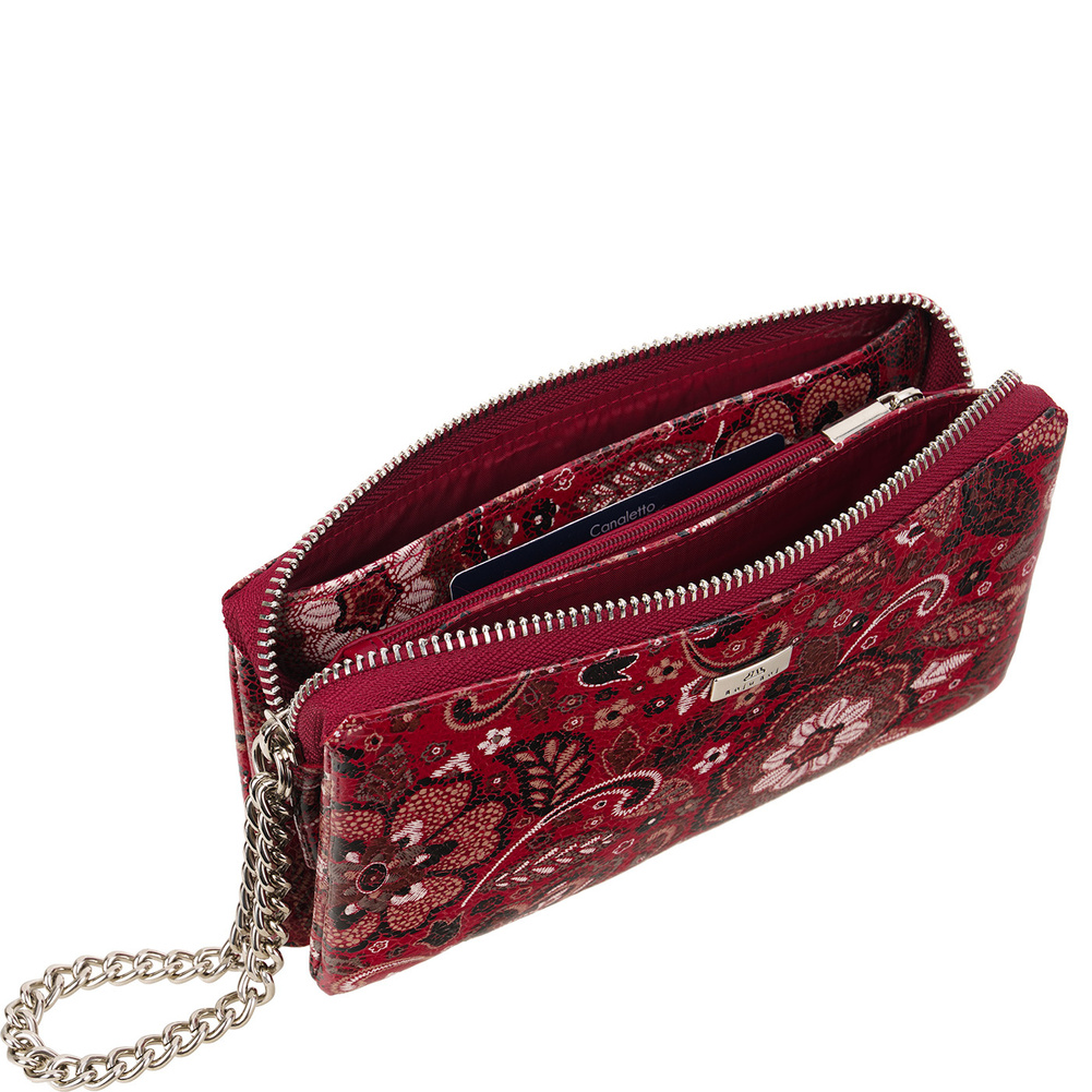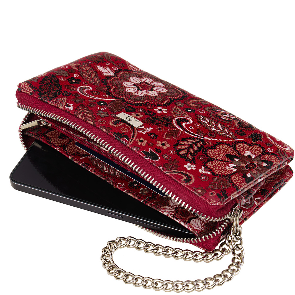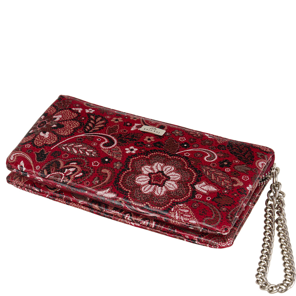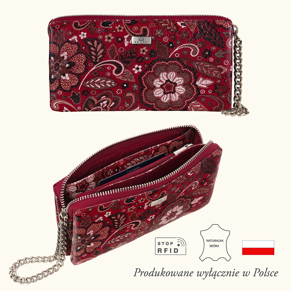 Portfel zapinany jest na metalowy suwak, który chroni zawartość, a jednocześnie dodaje całości charakteru. Ozdobny łańcuszek pełni podwójną funkcję – dekoracyjną i praktyczną, ponieważ pozwala wygodnie nosić portfel w dłoni jak niewielką kopertówkę.