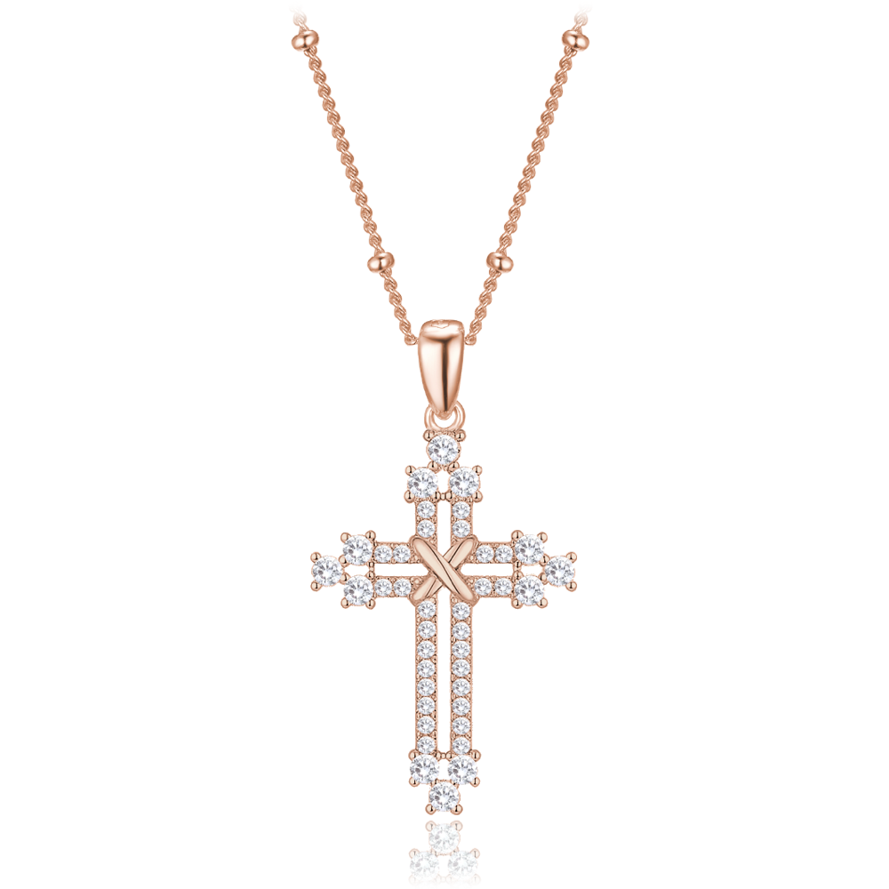 MINET Rose gold srebrny naszyjnik krzyżyk z cyrkoniami i łańcuszkiem z kulkami