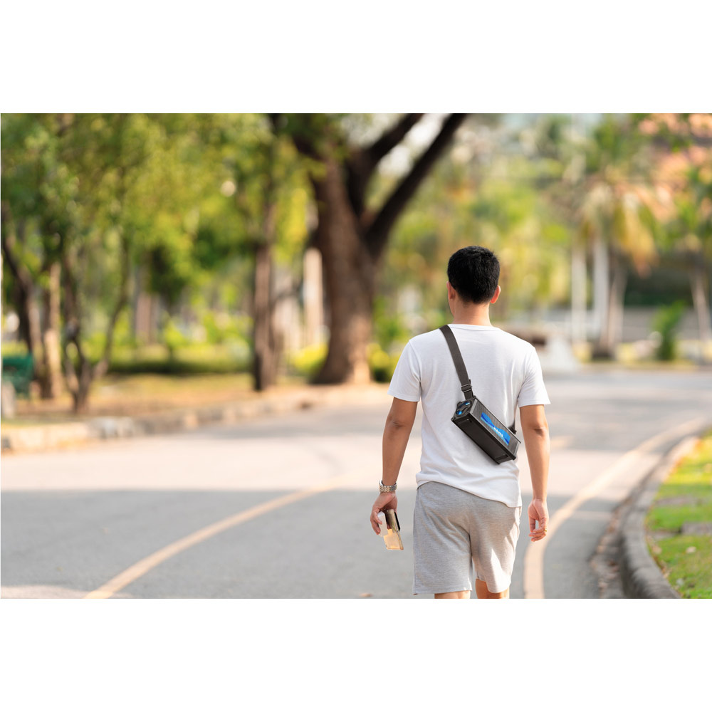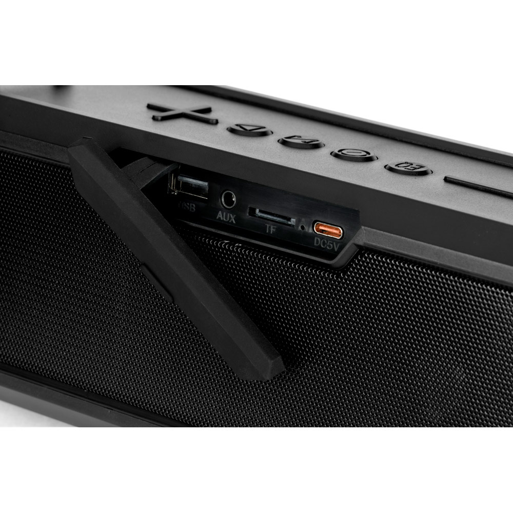 Przenośny głośnik z paskiem do przenoszenia i przechowywania, który można dopasować do ciała lub użyć jako krótkiego uchwytu. Bateria ma autonomię około 5 godzin i umożliwia ładowanie innych urządzeń.Materiał: ABSTransmisja bezprzewodowa: BT v5'0Wejście: USB-A, AUX 3.5 mm i USB-CMoc dźwięku: 16W (2x 8W)Pojemność: 3000 mAhWyjście: USB-A i AUX 3.5 mmFunkcje: sterowanie głośnością i listą odtwarzania urządzenia mobilnegoW zestawie: Kabel do ładowania USB-C i audio 3.5 mmW pełni konfigurowalna maskownicaDostawa: Białe pudełko upominkowe 250 x 100 x 90 mm