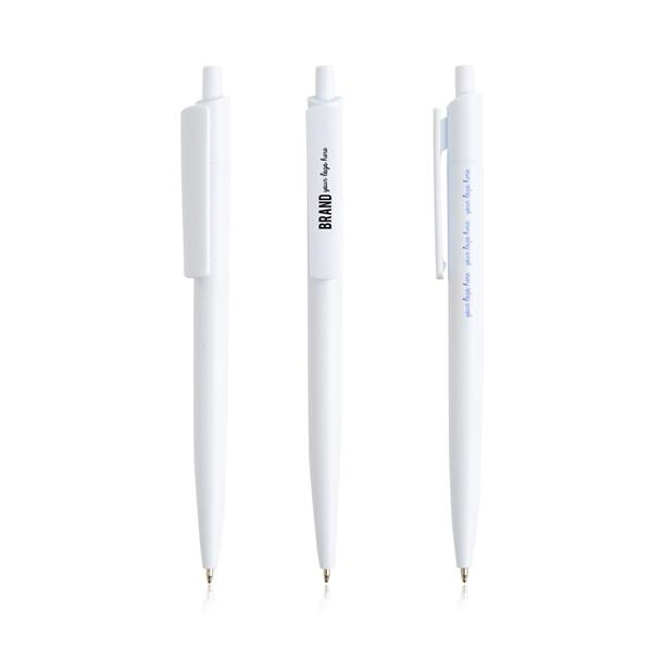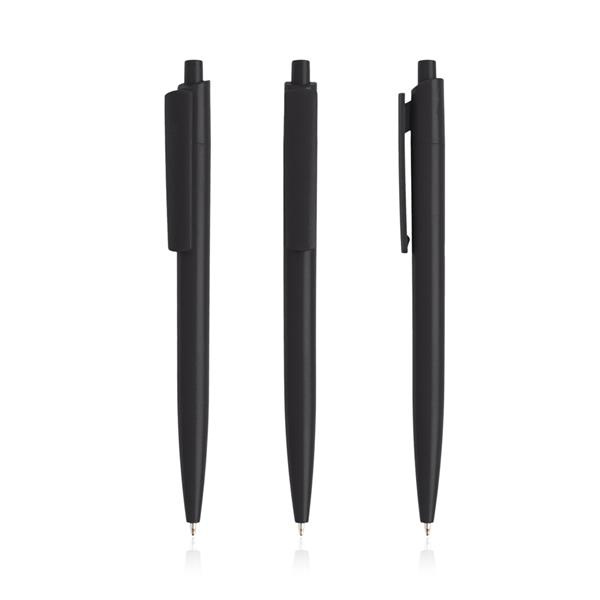 Długopis z recyklingowanego ABS. Recyklingowany długopis o nowoczesnym designie, z szerokim klipsem i jednokolorowym korpusem. Ten długopis z mechanizmem wciskanym pisze na niebiesko. Zobacz także wersję z białym korpusem i kolorowym klipsem, numer 131543.