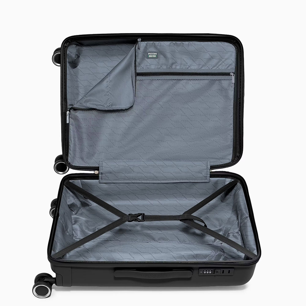- walizka twarda wykonana z polipropylenu, materiału charakteryzującego się super lekką wagą i niezwykłą wytrzymałością